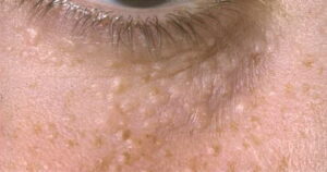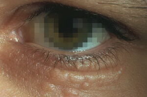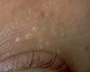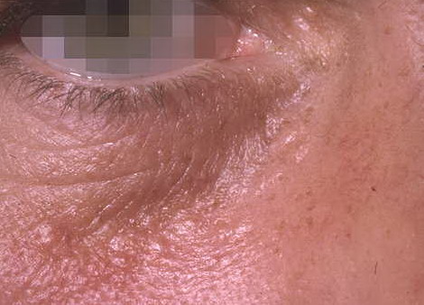 Eruptive hidradenoma, a rare type of syringoma, was studied histologically, histochemically, and electron microscopically in two patients. In spite of its peculiar clinical differences, such as occurrence of numerous lesions with limited distribution to anterior surfaces of the body, it showed features identical to the eyelid type syringoma. Direct connections were found between the lesions and epidermis and between individual lesions, but not between the lesions and underlying eccrine secretory segments. Also, cystic or tubular spaces were lined with an “immature eccrine intra-epidermal type” of epithelium which possessed a periluminal tonofilament band, lysosomes, keratohyaline granules, and often underwent complete keratinization. No secretory epithelium was found in the lesion. Dermal histiocytes with typical Langerhans cell granules and collagen fiber bundles were seen in parenchyma. It seemed that the lesion was undergoing constant destruction and regeneration