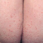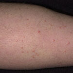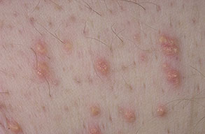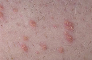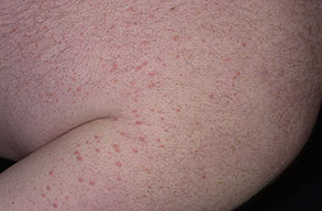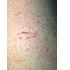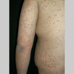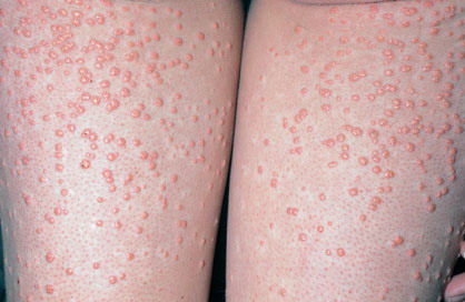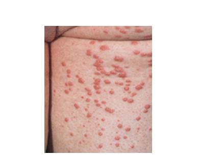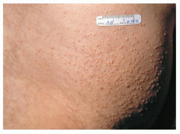 • Eruptive xanthomas most commonly arise over the buttocks, the shoulders, and the extensor surfaces of the extremities. Rarely, the oral mucosa or the face may be affected. The lesions typically erupt as crops of small, red-yellow papules on an erythematous base , and they may spontaneously resolve over weeks. Pruritus is common, and the lesions may be tender. Eruptive xanthomas are associated with hypertriglyceridemia, particularly that associated with types I, IV, and V (high concentrations of VLDL and chylomicrons). They may also appear in secondary hyperlipidemias, particularly in diabetes.2