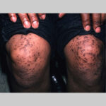 • Tuberous xanthomas are firm, painless, red-yellow nodules . The lesions can coalesce to form multilobated tumors. Tuberous xanthomas usually develop in pressure areas, such as the extensor surfaces of the knees, the elbows, and the buttocks. Tuberous xanthomas are particularly associated with hypercholesterolemia and increased levels of LDL. They can be associated with familial dysbetalipoproteinemia and familial hypercholesterolemia, and they may be present in some of the secondary hyperlipidemias (eg, nephrotic syndrome, hypothyroidism).