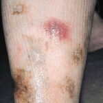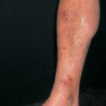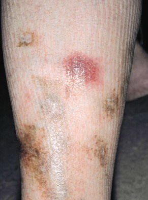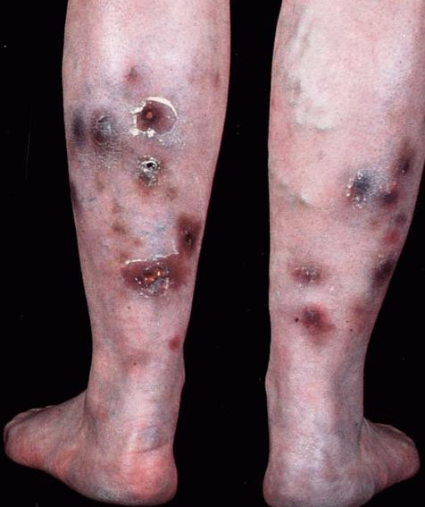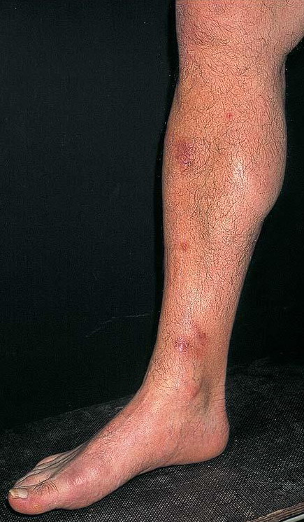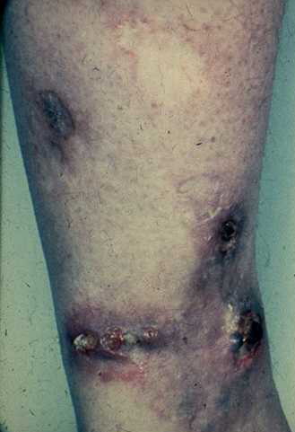 Erythema induratum of Bazin/nodular vasculitis (EIB/NV) is more frequent in middle-aged women, who develop erythematous subcutaneous nodules and plaques on the posterior aspects of the lower legs. Often, the involved extremities also show erythrocyanosis, heavy column-like calves, erythema surrounding follicular pores, and cutis marmorata . Usually, subcutaneous nodules become adherent to the skin surface, ulcerate , and then heal with scarring. The process is more frequent in obese women with some degree of venous insufficiency of the lower extremities, and the cutaneous lesions develop mostly during the cold months of the winter. Lesions are usually tender but may be indolent or painful under pressure. The course is protracted, and recurrent episodes over years, even decades, are common.