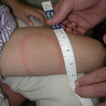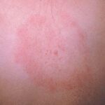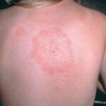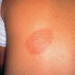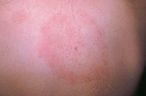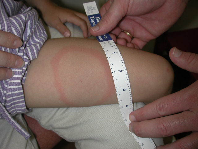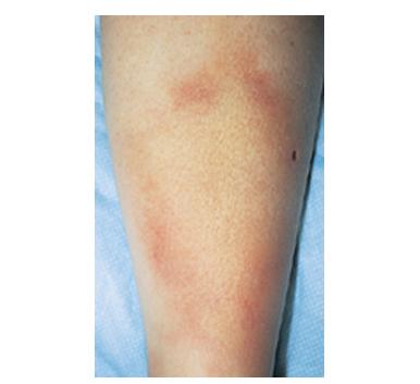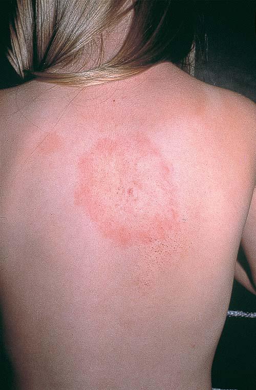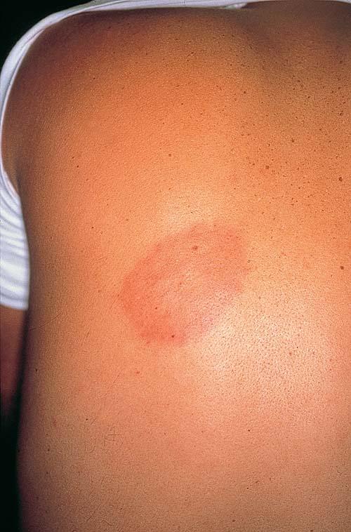 the bite site, with the transition between the central zone and periphery being less well demarcated than between that of the periphery and adjacent skin. The border is usually confluent and not patchy. Cases in which the erythema appears stationary or even linear are reported. Typically described as round, the lesion in reality is more oval with the “long line of the oval parallel to the lines of least skin tension” (Langer lines) As migration of the lesion proceeds, distortion of this configuration occurs. The center fades after a few weeks leaving only the annular border erythematous . In very large lesions, only a portion of the erythematous border can be seen Uncommon presentations include the entire lesion being homogenously erythematous (“solidly erythematous”) (10 percent), forms with marked central necrosis, minimal size EM (size of the ring less than 5 cm at initial presentation) (2 percent), and the vesicular variant (5 percent).