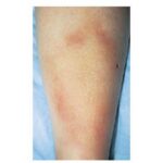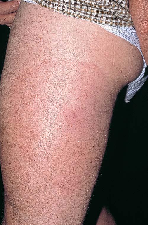 EM may be seen anywhere on the body but is most common on the lower extremities, inguinal and axillary regions of adults and on the face in children (“slapped cheek” appearance) reflecting sites of predilection of the tick. Although no definite sex predilection has been noted in the United States, women are reported to be more commonly affected in European studies.