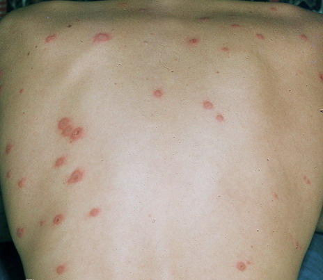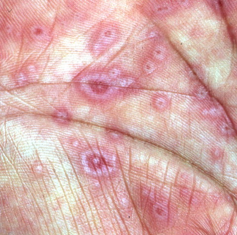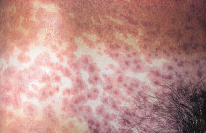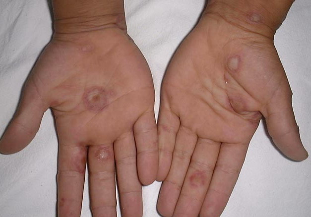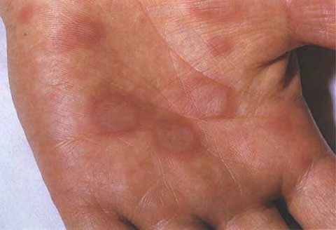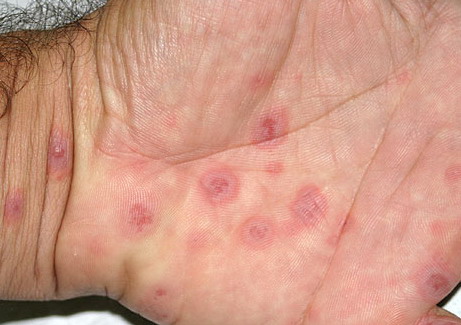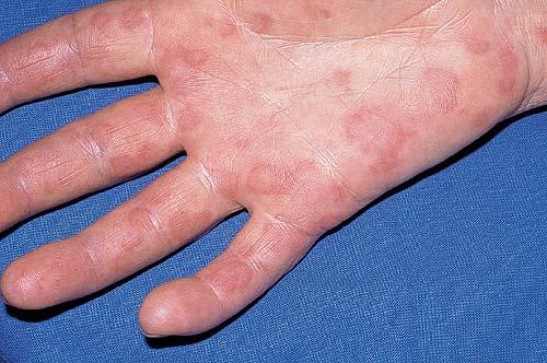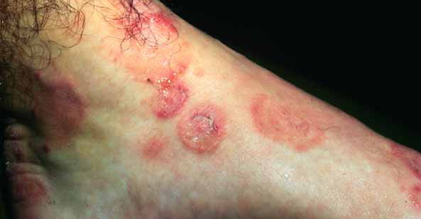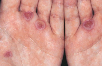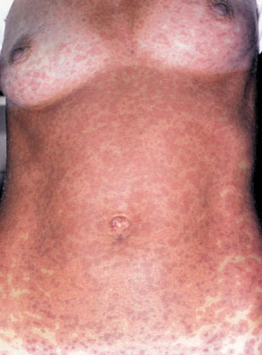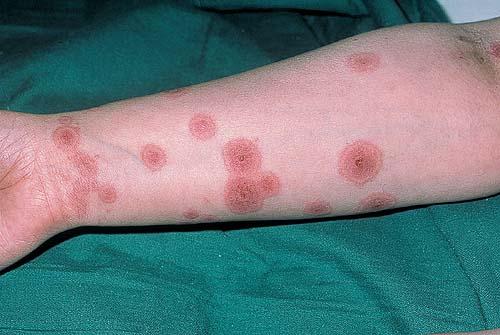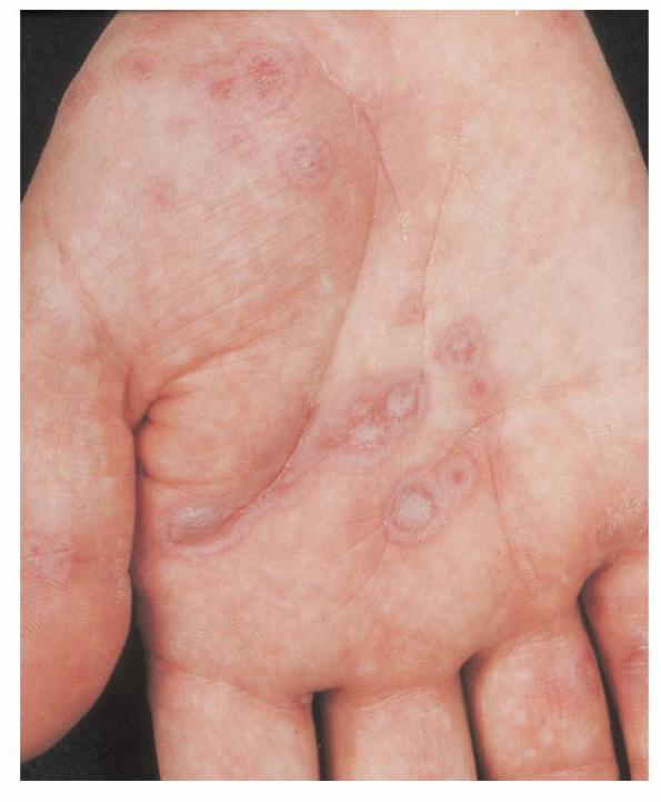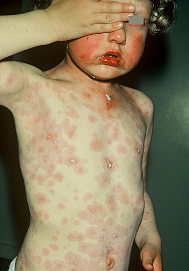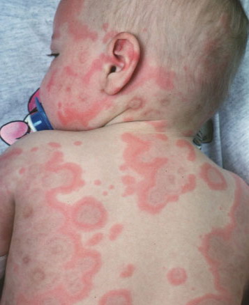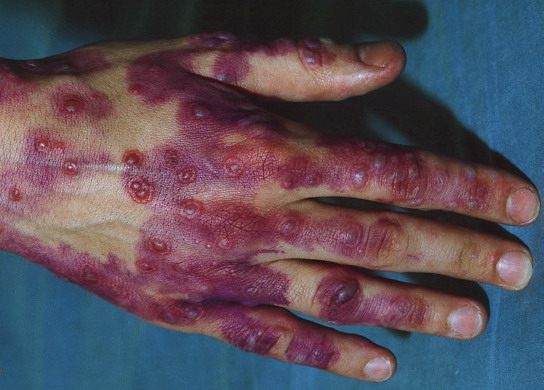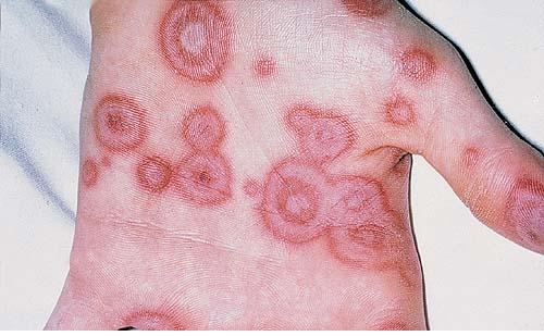 ▪ Widespread polymorphous target-like lesions, macules, papules, plaques