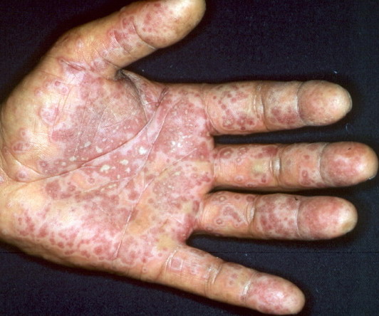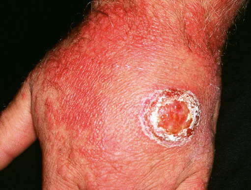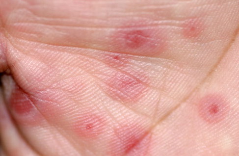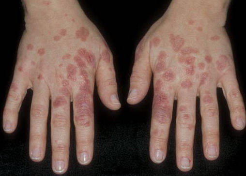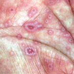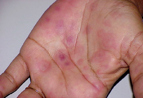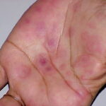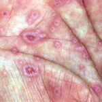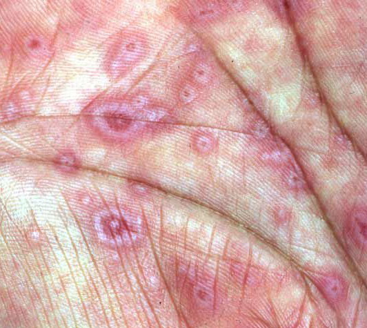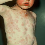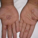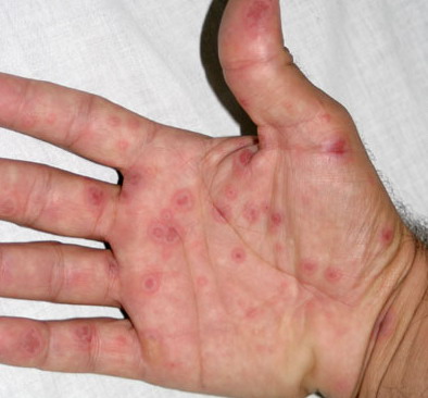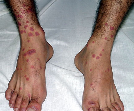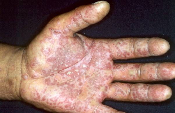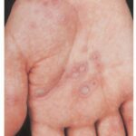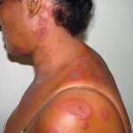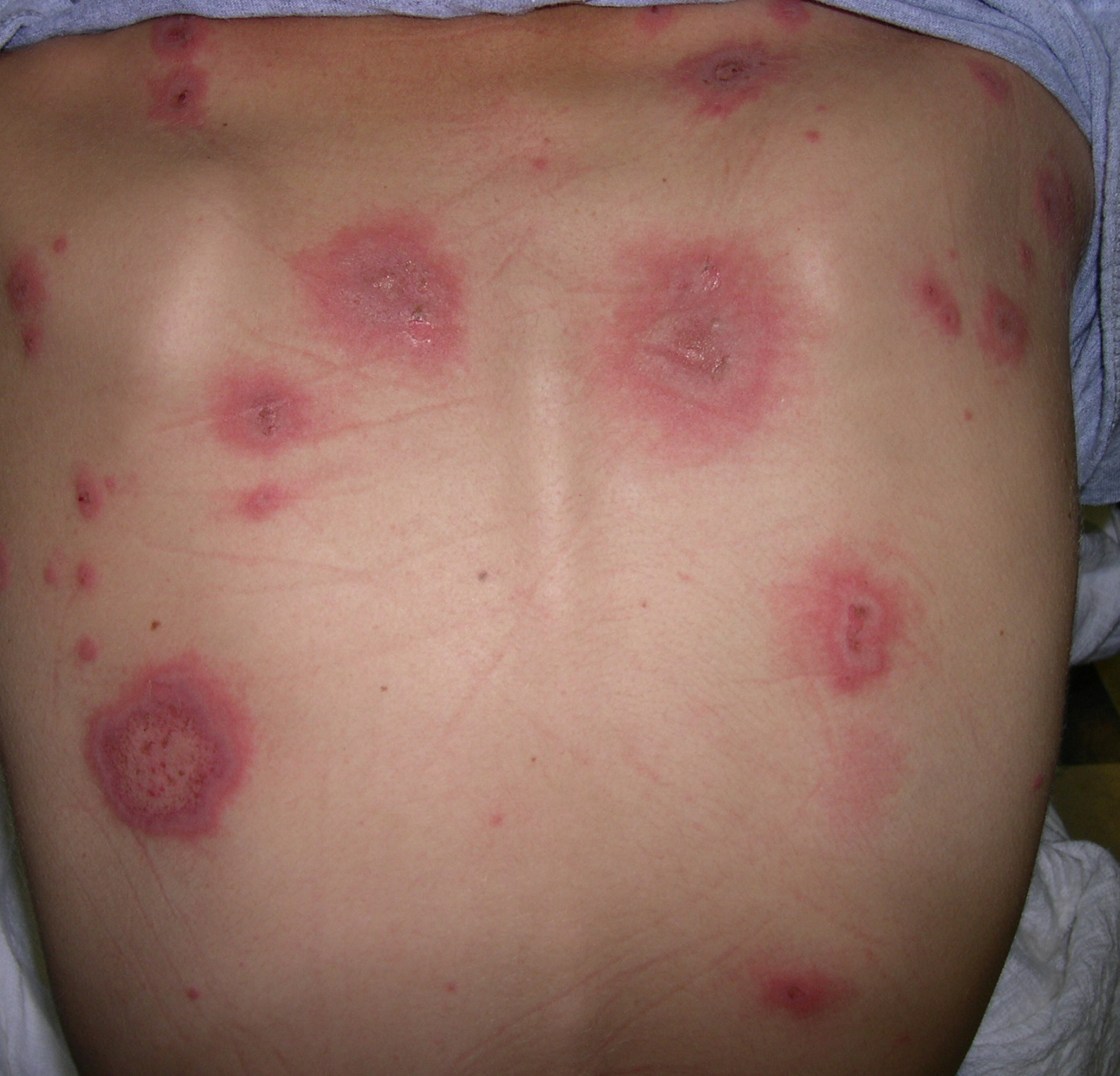 ▪ Widespread polymorphous target-like lesions, macules, papules, plaques