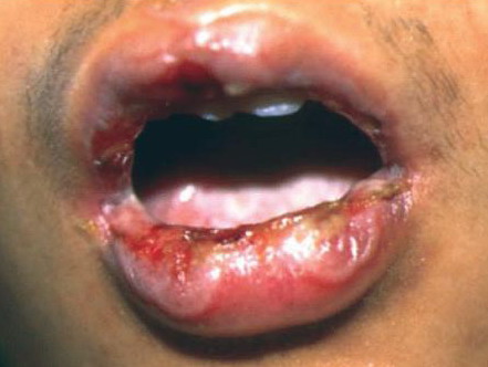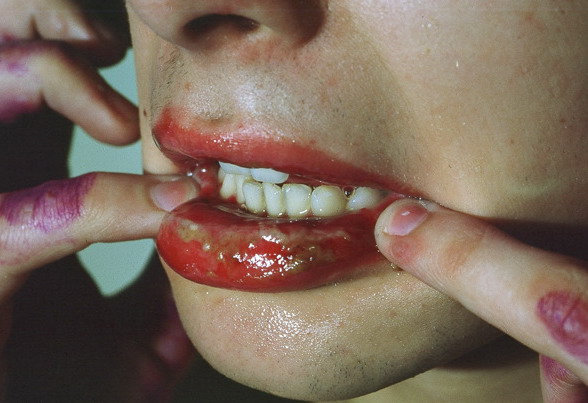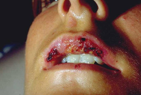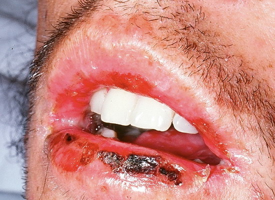 Predilection sites for mucosal lesions are the lips, on both cutaneous and mucosal sides; non-attached gingivae; and the ventral side of the tongue. The hard palate is usually spared, as are the attached gingivae. On the cutaneous part of the lips, identifiable target lesions may be discernible (see Fig. 38-3). On the mucosa proper there are erosions with fibrinous deposits, and occasionally intact vesicles and bullae can be seen . The process may rarely extend to the throat, larynx, and even the trachea and bronchi.