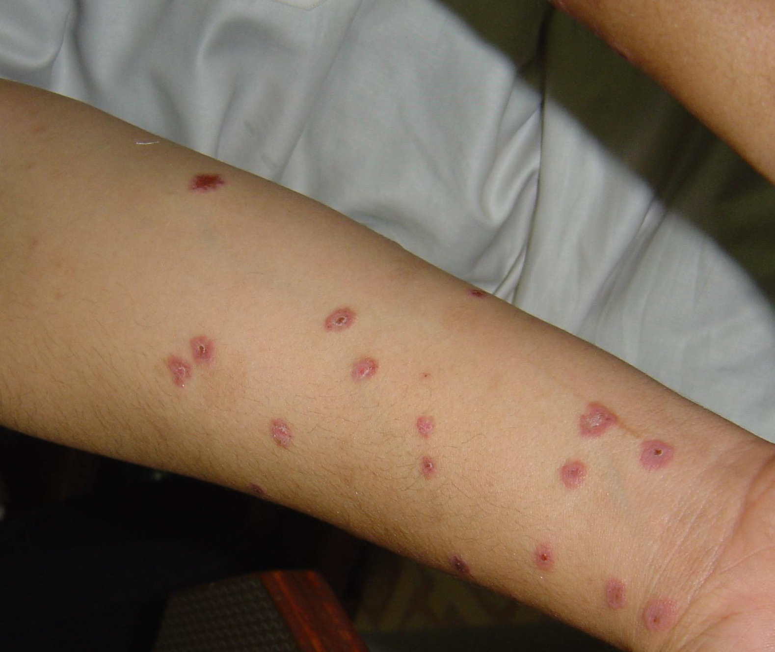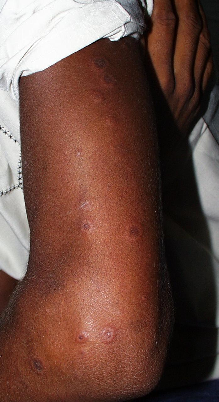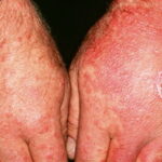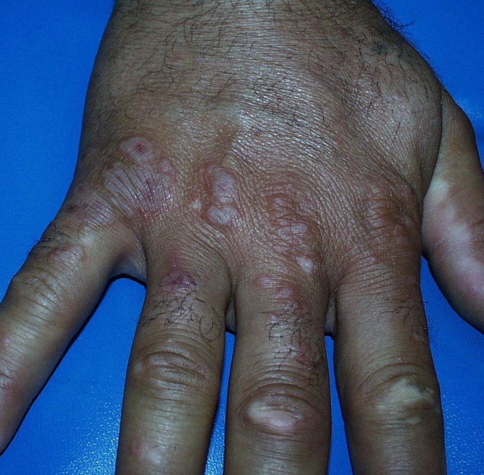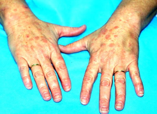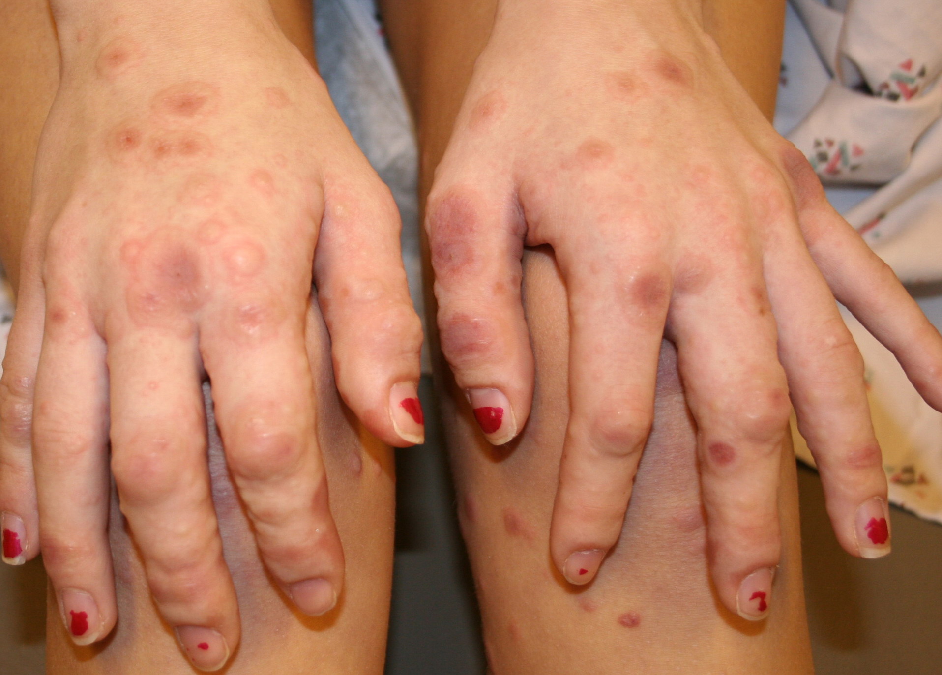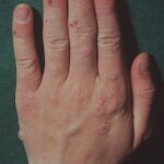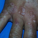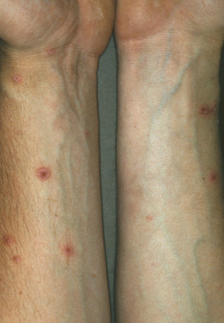 Often there are a limited number of lesions, but up to hundreds may form. Most occur in a symmetric, acral distribution on the extensor surfaces of the extremities (hands and feet, elbows, and knees), face, and neck and appear less frequently on thighs, buttocks, and trunk. Lesions often first appear acrally and then spread in a centripetal manner. Mechanical factors (Koebner phenomenon) and actinic factors (predilection of sun-exposed sites) appear to influence the distribution of lesions. Although patients occasionally report burning and itching, the eruption is usually asymptomatic.