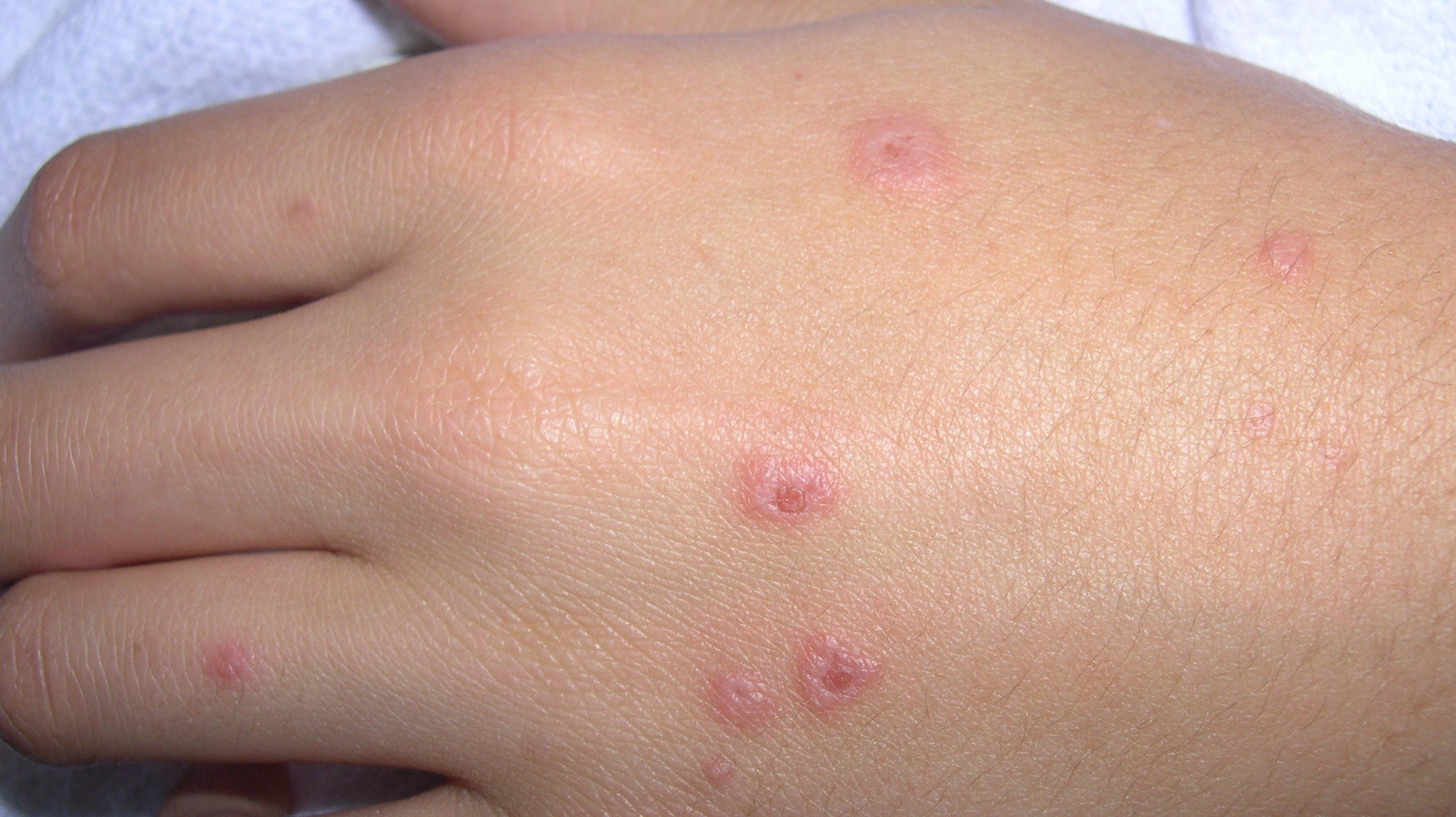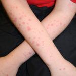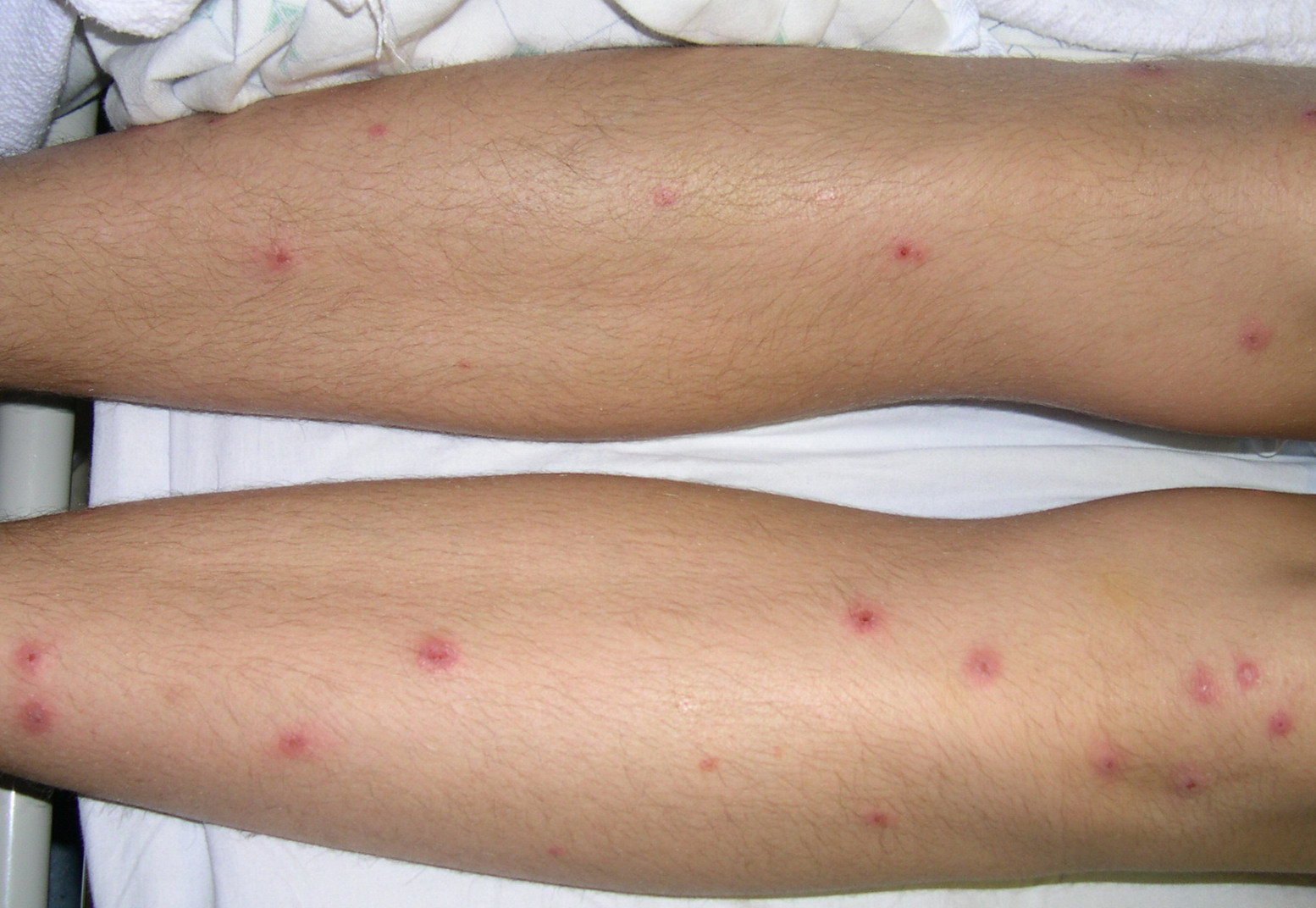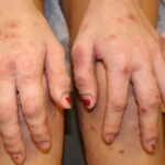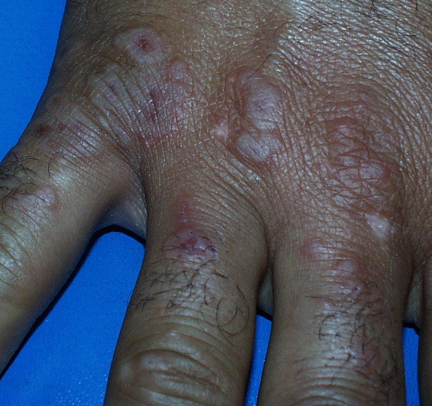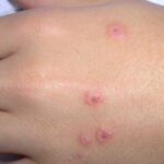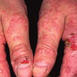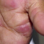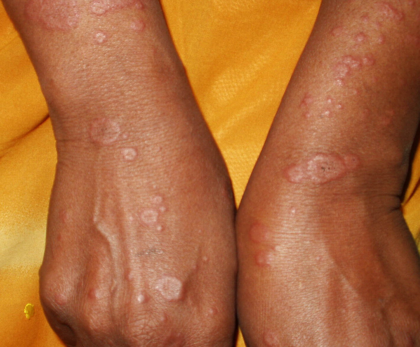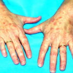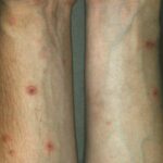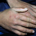 Often there are a limited number of lesions, but up to hundreds may form. Most occur in a symmetric, acral distribution on the extensor surfaces of the extremities (hands and feet, elbows, and knees), face, and neck and appear less frequently on thighs, buttocks, and trunk. Lesions often first appear acrally and then spread in a centripetal manner. Mechanical factors (Koebner phenomenon) and actinic factors (predilection of sun-exposed sites) appear to influence the distribution of lesions. Although patients occasionally report burning and itching, the eruption is usually asymptomatic.