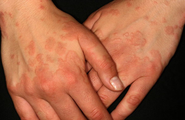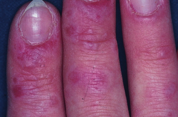 The designation of Rowell syndrome11 is used for a variety of cutaneous lupus erythematosus with lesions resembling those of EM. Subacute evolution, a positive result on direct fluorescence testing, and the presence of anti-nuclear antibodies exclude EM.