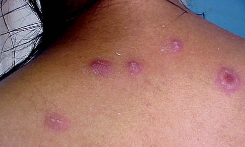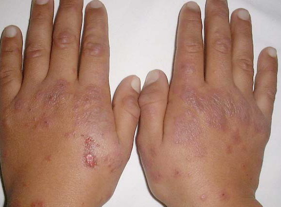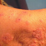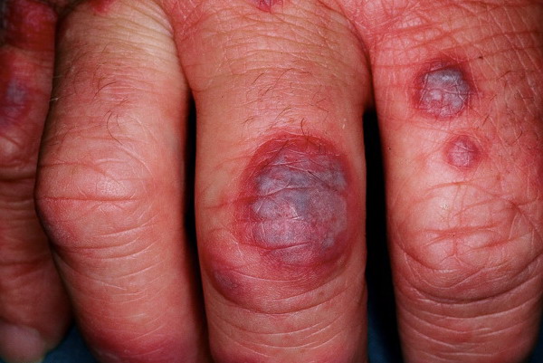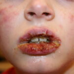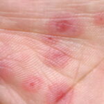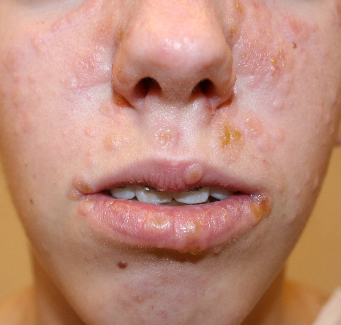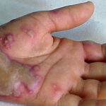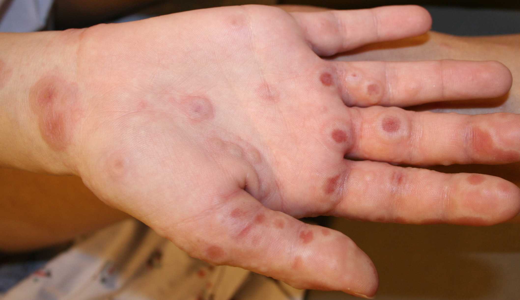 Most cases of EM are related to infections. Herpes virus is definitely the most common cause, principally in recurrent cases. Proof of causality of herpes is firmly established from clinical experience, epidemiology, detection of HSV DNA in the lesions of EM, and prevention of EM by suppression of HSV recurrences.Clinically, a link with herpes can be established in about one-half of cases. In addition 10 percent to 40 percent of cases without clinical suspicion of herpes were also demonstrated to be herpes related, because HSV DNA was detected in the EM lesions by polymerase chain reaction (PCR) testing. EM eruptions begin on average 7 days after a recurrence of herpes. The delay can be substantially shorter. Not all symptomatic herpes recurrences are followed by EM, and asymptomatic ones can induce EM. Therefore, this causality link can be overlooked by both patients and physicians. HSV-1 is usually the cause, but HSV-2 can also induce EM. The proportion probably reflects the prevalence of infection by HSV subtypes in the population.