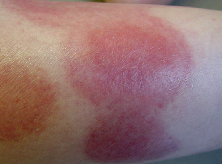 The diversity in clinical pattern implied by the name multiforme is mainly due to the findings in each single lesion; most lesions are usually rather similar in a given patient at a given time. The typical lesion is a highly regular, circular, wheal-like erythematous papule or plaque that persists for 1 week or longer . It measures from a few millimeters to approximately 3 cm and may expand slightly over 24 to 48 hours. Although the periphery remains erythematous and edematous, the center becomes violaceous and dark; inflammatory activity may regress or relapse in the center, which gives rise to concentric rings of color . Often, the center turns purpuric and/or necrotic or transforms into a tense vesicle or bulla. The result is the classic target or iris lesion.