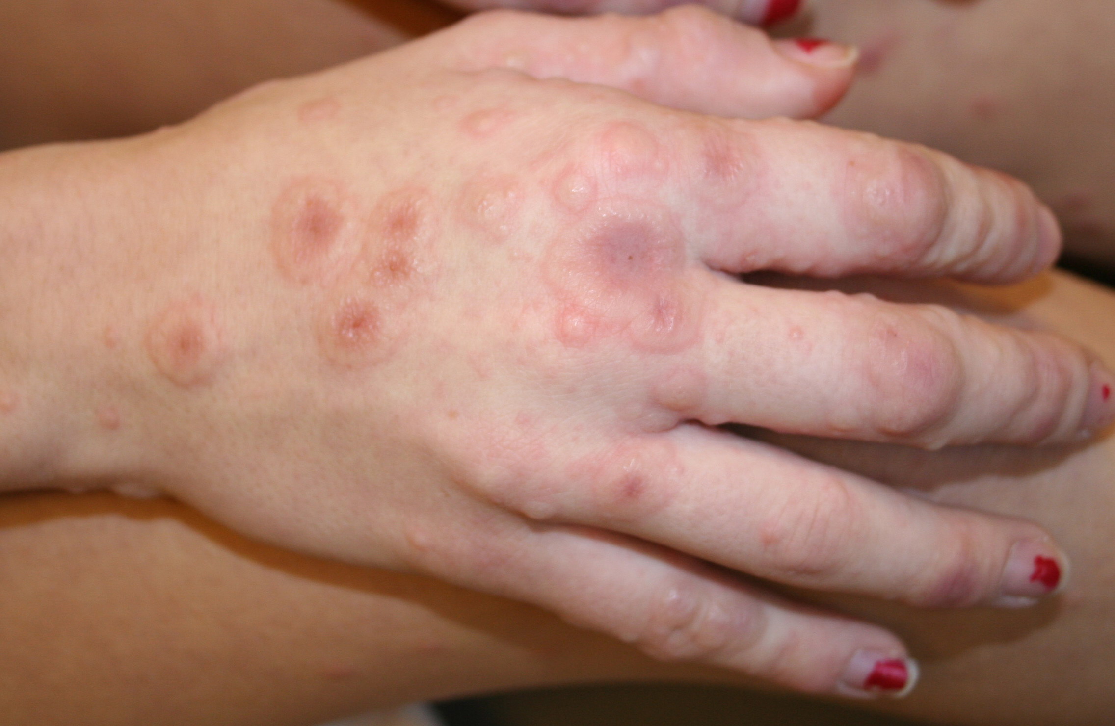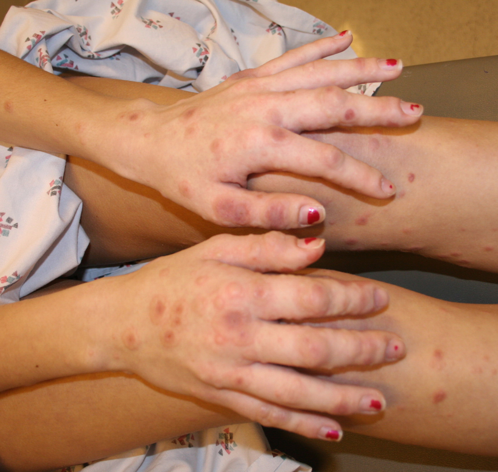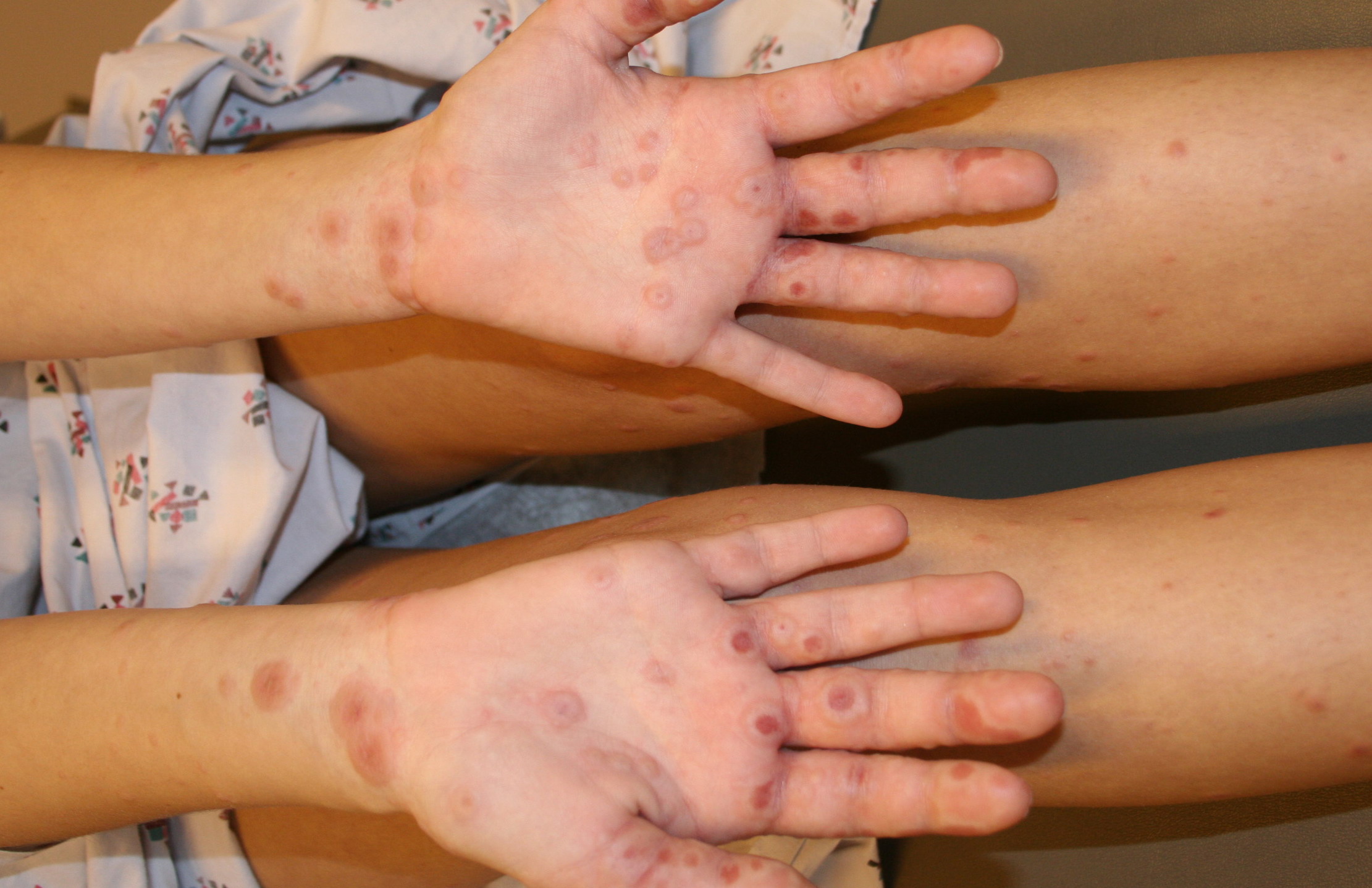 Drugs are a rare cause of EM with mucous membrane lesions. It may be argued whether these eruptions are truly EM or mere imitators, for example, annular urticaria or maculopapular eruption with some lesions resembling targets.