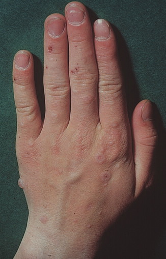 The absence of specific pathology, specific cause, and biologic markers contribute to a confusing nosology. The definition of EM in this chapter is based on the classification proposed by Bastuji-Garin et al. The principle of this classification is to consider Stevens-Johnson syndrome (SJS) as a minor form of toxic epidermal necrolysis (TEN) and to separate these two diseases from EM . The validity of this classification has been challenged by some studies, especially for cases in children and cases related to Mycoplasma pneumoniae. It has been confirmed by several others studies, however, especially the prospective international Severe Cutaneous Adverse Reactions study.2 That study demonstrated that, compared with SJS patients, EM patients were younger, more often male, had a 10-fold higher rate of recurrence, and less frequently had a body temperature higher than 38.5°C (101.3°F) and involvement of two or more mucous membranes.