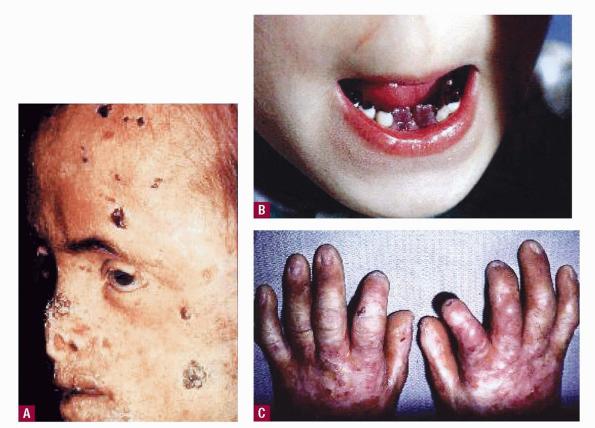 - Increased fragility and erosions can contribute to mutilation, especially on the face (eg, nose, mouth, ears) and hands.