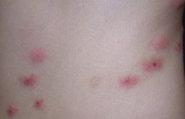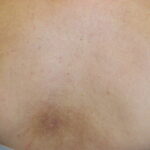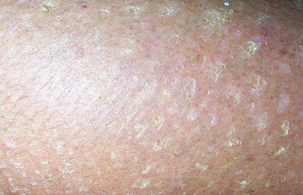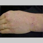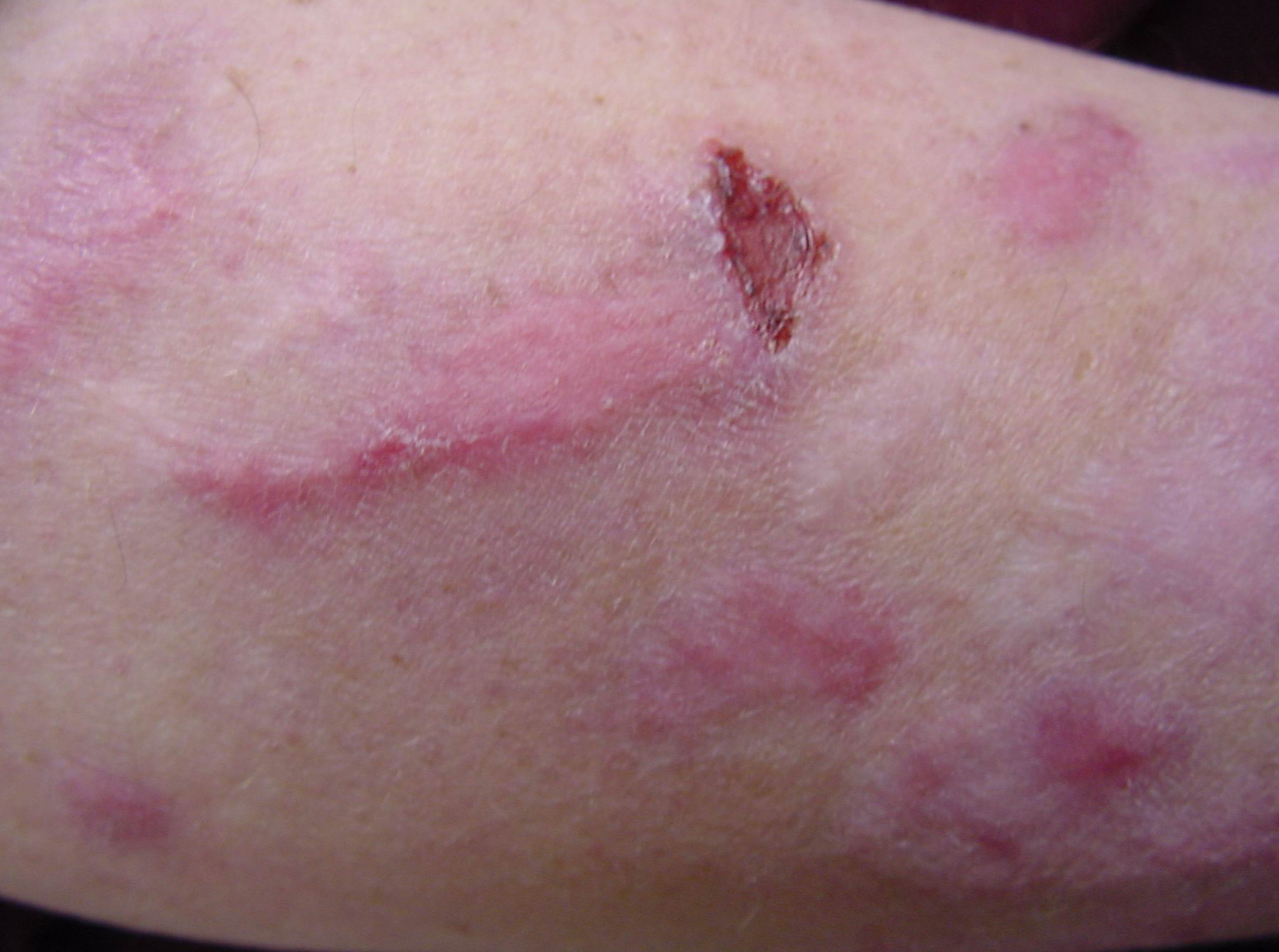 Often, right-handed persons tend to pick at their left side and left-handed people pick at their right side. The erosions and scars tend to have angulated borders. The quantity of erosions and scars is variable. Several lesions to hundreds of lesions can be present. Erosions, crusts, and scars are only located where the patient can pick. Lesions can be crusted or noncrusted