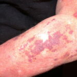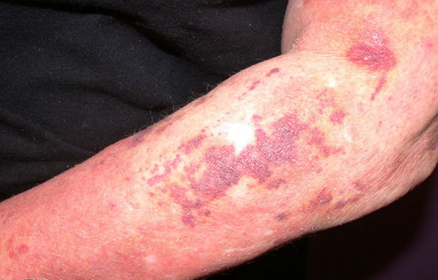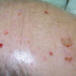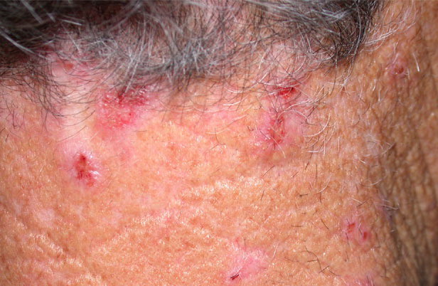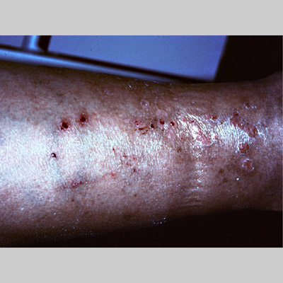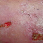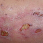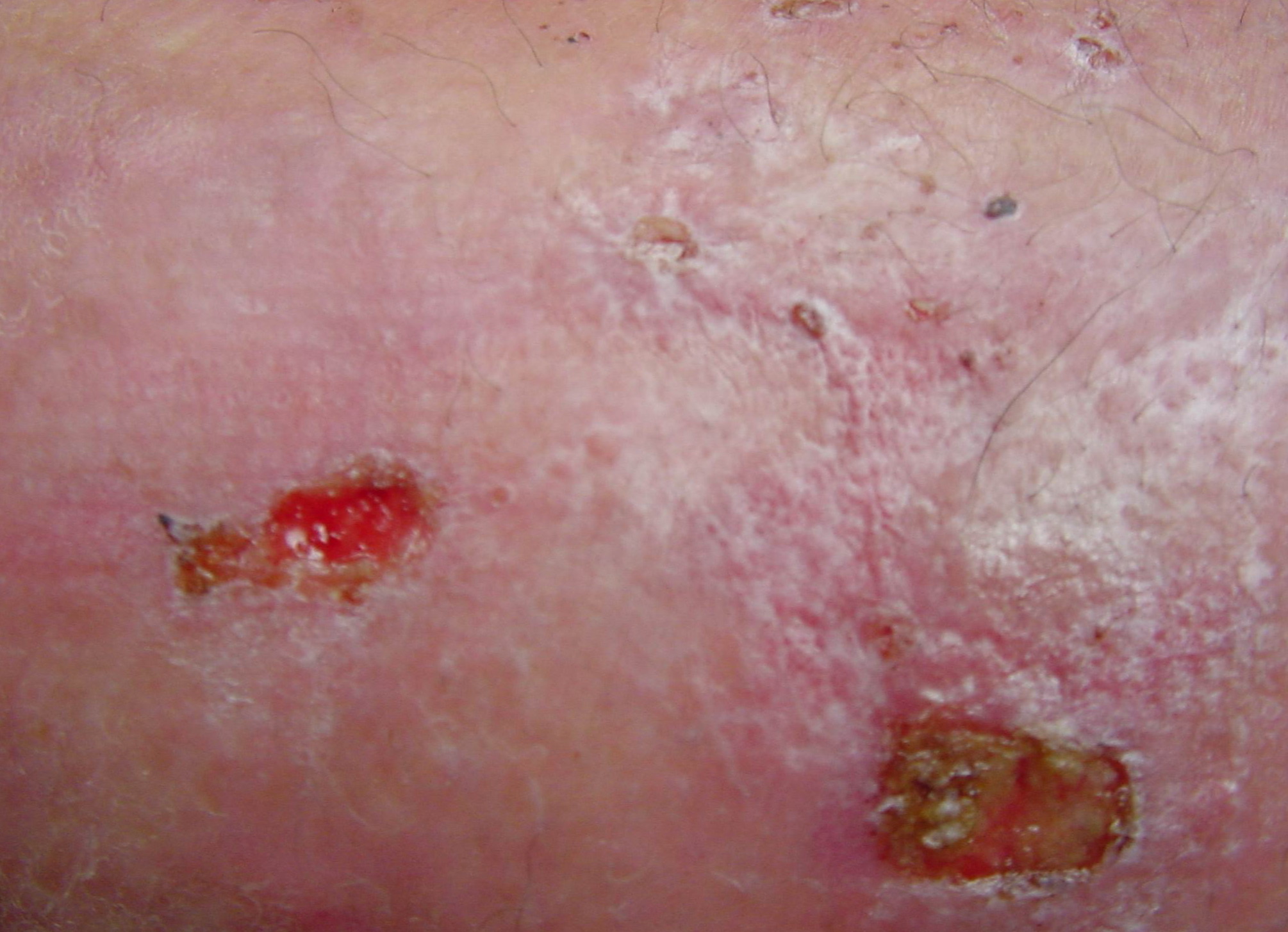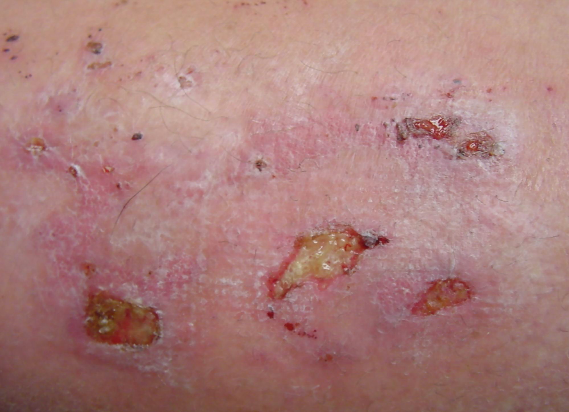 Erosions can vary in morphology and can sometimes evolve into frank ulcers. Dug-out erosions or ulcers, crusted erosions, and ulcers can be present. Sometimes, erythema and scars are present around the erosions and the ulcers.