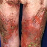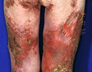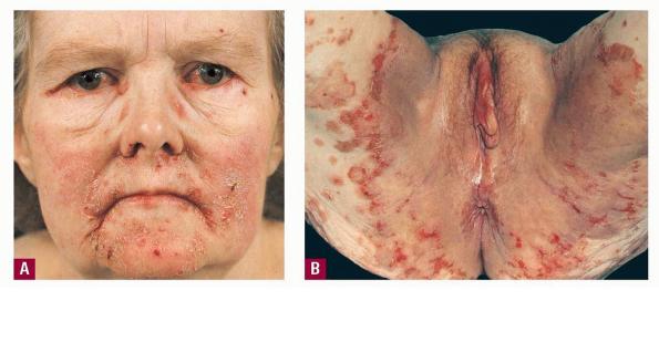 First described by Becker, Kahn, and Rothman in 1942, the glucagonoma syndrome is an uncommon clinicopathologic entity. It is characterized by a glucagon-secreting tumor associated with hyperglucagonemia; necrolytic migratory erythema (NME); diabetes mellitus; hypoaminoacidemia; cheilosis; a normochromic, normocytic anemia; venous thrombosis; weight loss; and neuropsychiatric features. The finding of NME was once considered pathognomonic for glucagonoma syndrome. However, publications have reported that neither glucagonoma nor hyperglucagonemia is necessary for NME.1 Pseudoglucagonoma syndrome refers to NME in the absence of a glucagon-secreting tumor.2,3
