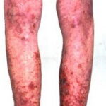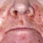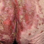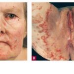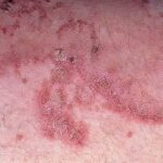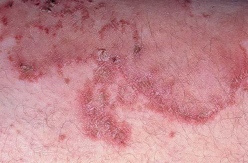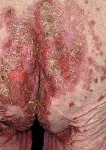 NME can be found anywhere on the body, although it has a predilection for the perineum, buttocks, groin, lower abdomen, and lower extremities, areas subject to greater pressure and friction. The lesions wax and wane in a cycle of about 10 days, beginning with an erythematous patch that blisters centrally, erodes, and then crusts over and heals with hyperpigmentation. The lesions are typically annular and may demonstrate confluence in severely affected areas. Patients report intense discomfort because these lesions are pruritic and painful. Other associated mucocutaneous findings include atrophic glossitis, cheilosis, onychoschizia, buccal mucosal inflammation, and, rarely, dyspareunia.