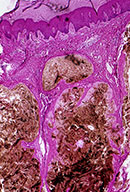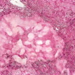 Histopathology. For the histologic examination of tophi, fixation in absolute ethanol or an ethanol-based fixative, such as Carnoy’s fluid, is preferable to fixation in formalin; it has been stated that aqueous fixatives such as formalin dissolve the characteristic urate crystals, leaving only amorphous material . However, some authors contend that formalin-fixed, paraffin-embedded tissue that is sectioned, floated in alcohol {as opposed to a water bath}, and then placed onto a slide without staining will display refractile crystals when examined under polarized light . An alternate staining protocol to preserve any urate crystals remaining in formalin-fixed tissue after processing also has been forwarded . |