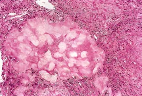 characteristic rim of foreign body giant cells and macrophages surrounding the aggregates of amorphous material. As a secondary phenomenon, calcification, and occasionally ossification, may take place in the sodium urate aggregates. |