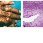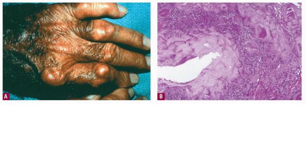 In the early stage of gout, there usually are irregularly recurring attacks of acute arthritis. In the late stage, deposits of monosodium urate form within and around various joints, leading to chronic arthritis with destruction in the joints and the adjoining bone. During this late stage, urate deposits, called tophi, may occur in the dermis and subcutaneous tissue. The incidence of tophaceous lesions in gout has significantly decreased since 1950, from 14% to 3%, even though the incidence of gout has remained unchanged. Improved methods of treatment account for this decrease |