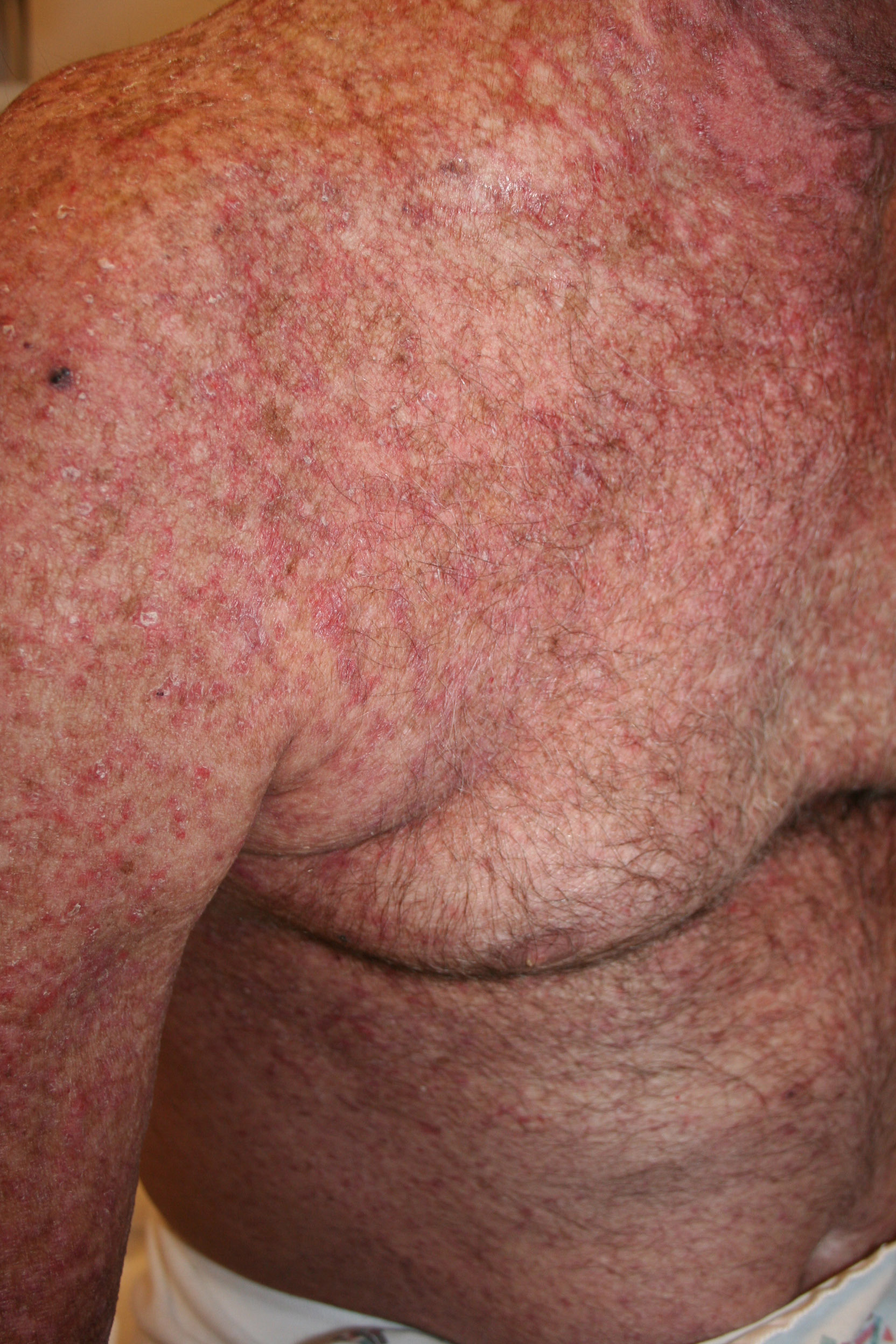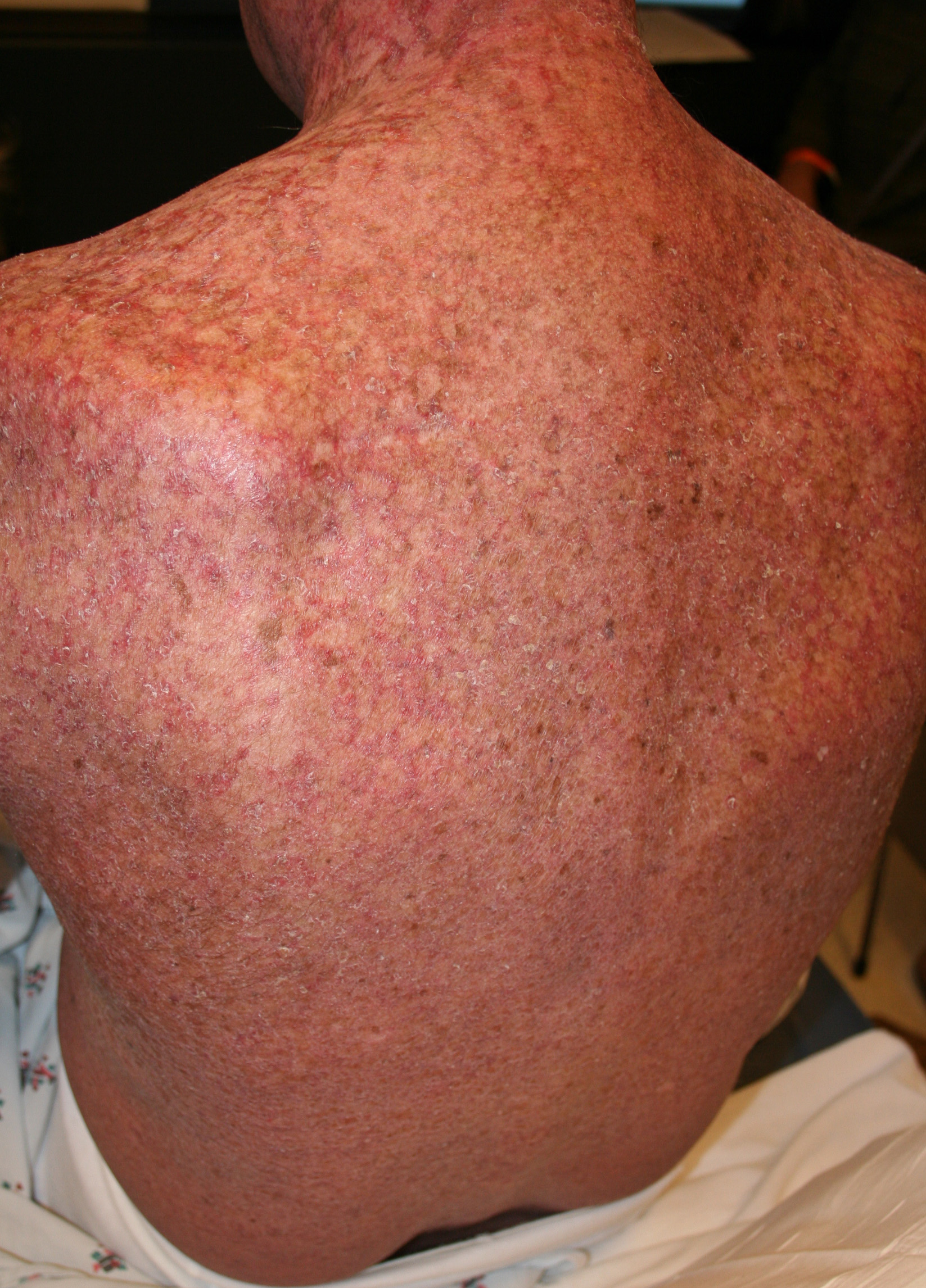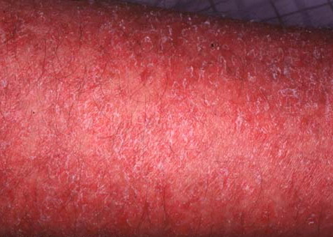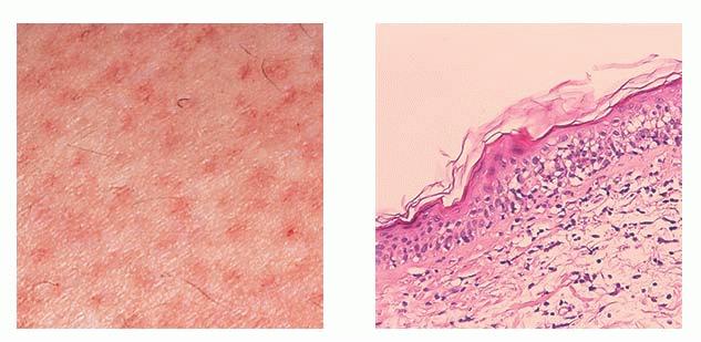 In the acute phase, the classic triad includes skin lesions, hepatic dysfunction, and diarrhea. The clinical severity is judged on the extent of the cutaneous eruption, total bilirubin, and stool volume. The eruption is characterized by extensive macular erythema, a morbilliform eruption, purpuric lesions, violaceous scaly papules and plaques, bullae, or in rare cases a TEN-like epidermal detachment. There is a predilection for the cheeks, ears, neck, upper chest, and palms and soles. Occasionally, follicular papules are seen simulating a folliculitis. Oral lesions may be present. About 30% of patients die from complications of acute GVHD. The overall clinical stage, during the first 40 days after transplantation, is useful in identifying patients with progressive and fatal disease . Cutaneous GVHD may be due to a synergistic effect from local irradiation .
