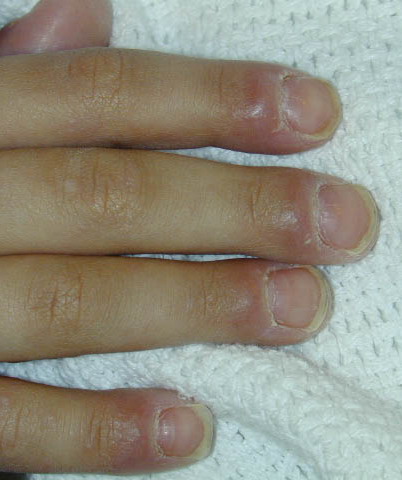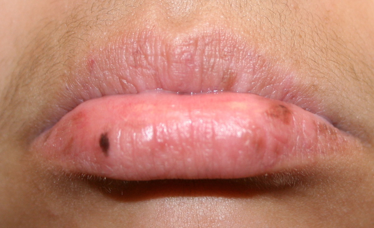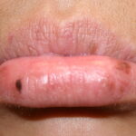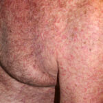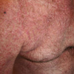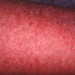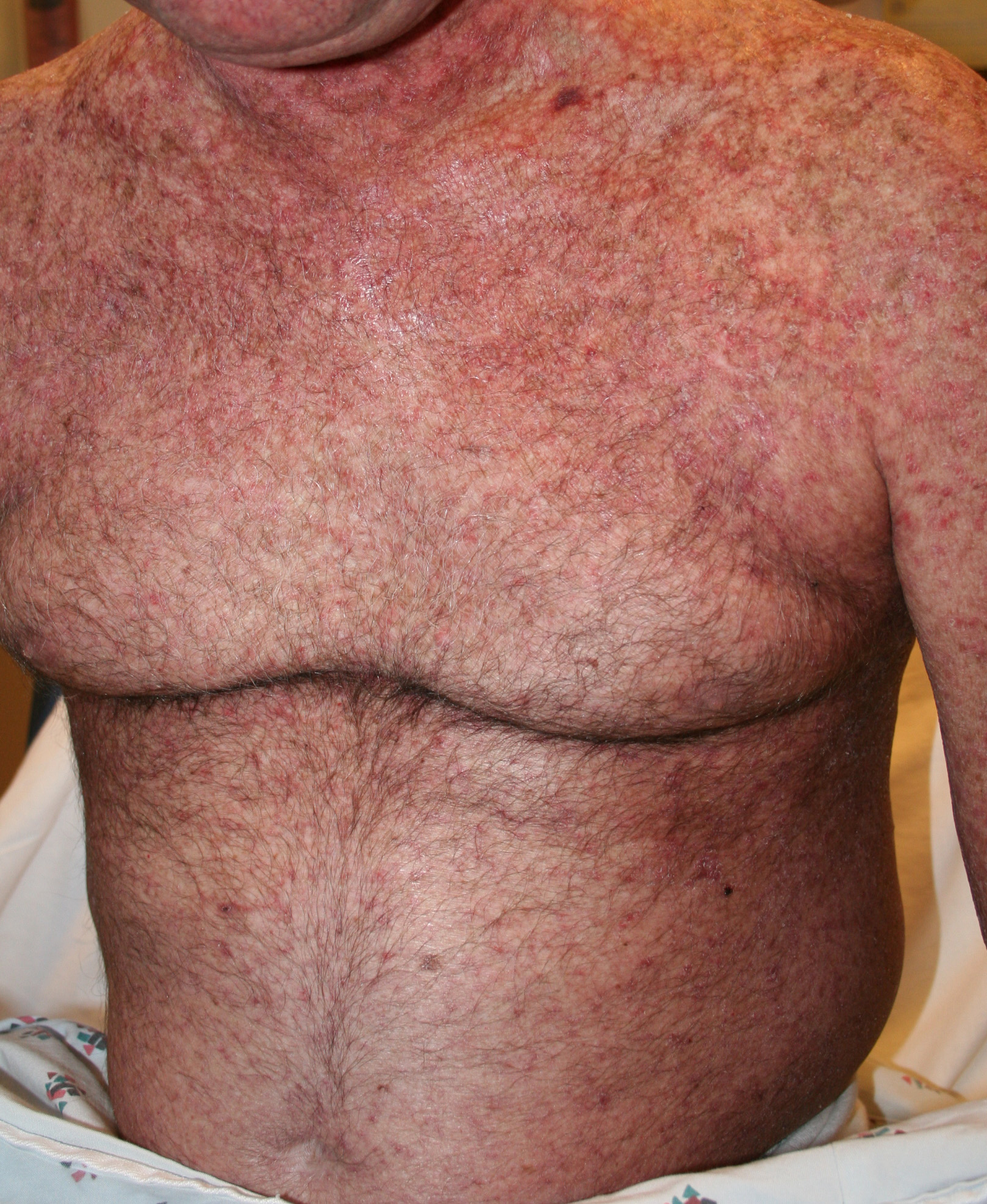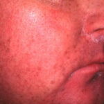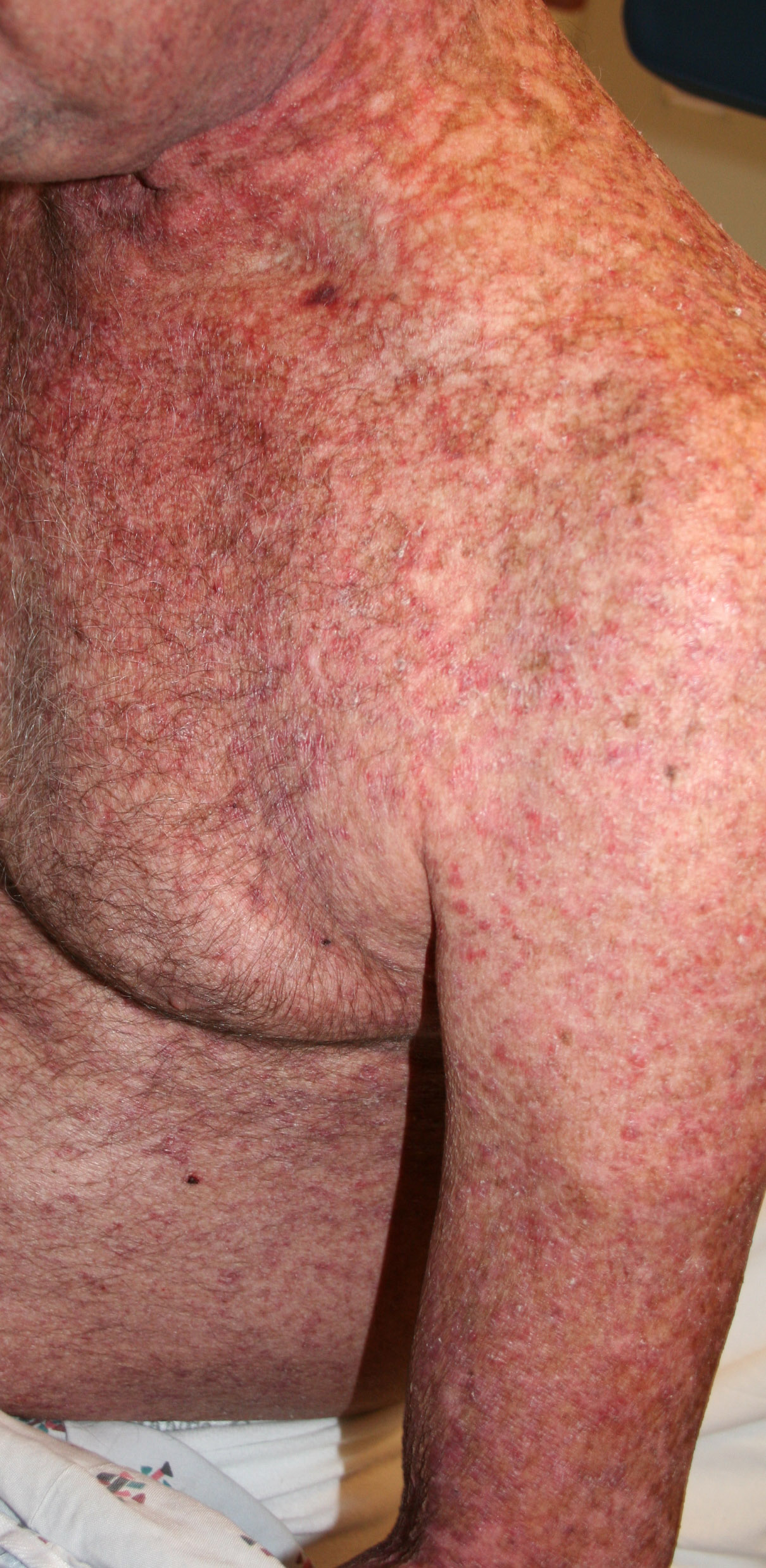 In the acute phase, the classic triad includes skin lesions, hepatic dysfunction, and diarrhea. The clinical severity is judged on the extent of the cutaneous eruption, total bilirubin, and stool volume. The eruption is characterized by extensive macular erythema, a morbilliform eruption, purpuric lesions, violaceous scaly papules and plaques, bullae, or in rare cases a TEN-like epidermal detachment. There is a predilection for the cheeks, ears, neck, upper chest, and palms and soles. Occasionally, follicular papules are seen simulating a folliculitis. Oral lesions may be present. About 30% of patients die from complications of acute GVHD. The overall clinical stage, during the first 40 days after transplantation, is useful in identifying patients with progressive and fatal disease . Cutaneous GVHD may be due to a synergistic effect from local irradiation .