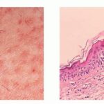 perivascular lymphocytic infiltrate with exocytosis of individual cells into the epidermis and follicular epithelium. The number of lymphocytes correlates positively with the probability of developing more severe acute GVHD . In association with the perivascular infiltrate, there is marked endothelial cell swelling and narrowing of the vascular lumen. Established lesions show more pronounced vacuolation, focal spongiosis, lymphocytic infiltration, and dyskeratosis at all levels of epidermis. The acute phase has been divided into four histopathologic grades . In grade 1 disease, there is focal or diffuse vacuolization of the basal cell layer. In grade 2 lesions, spongiosis and dyskeratotic keratinocytes are identified , with some accompanied by two or more epidermal lymphocytes, a phenomenon known as satellite cell necrosis. The necrotic keratinocytes contain a pyknotic nucleus and eosinophilic cytoplasm. Grade 3 lesions are characterized by subepidermal cleft formation. In grade 4, there is complete loss of the epidermis. In cases with follicular papules, the involved follicles show degenerate changes in the cells of the follicular epithelium similar to those in the epidermis. In rare cases, basal vacuolization and dyskeratosis of the follicular epithelium may be the only changes .