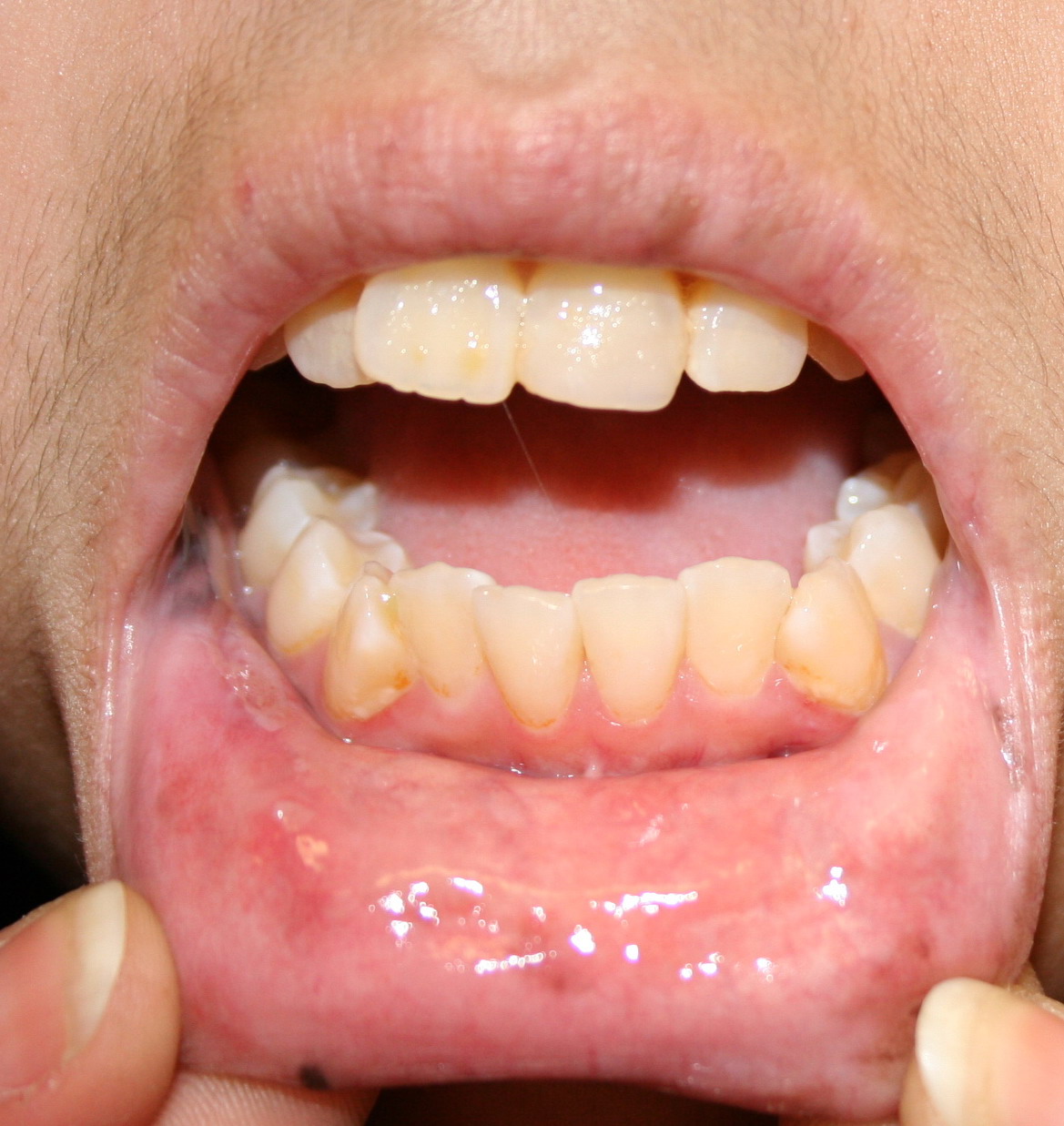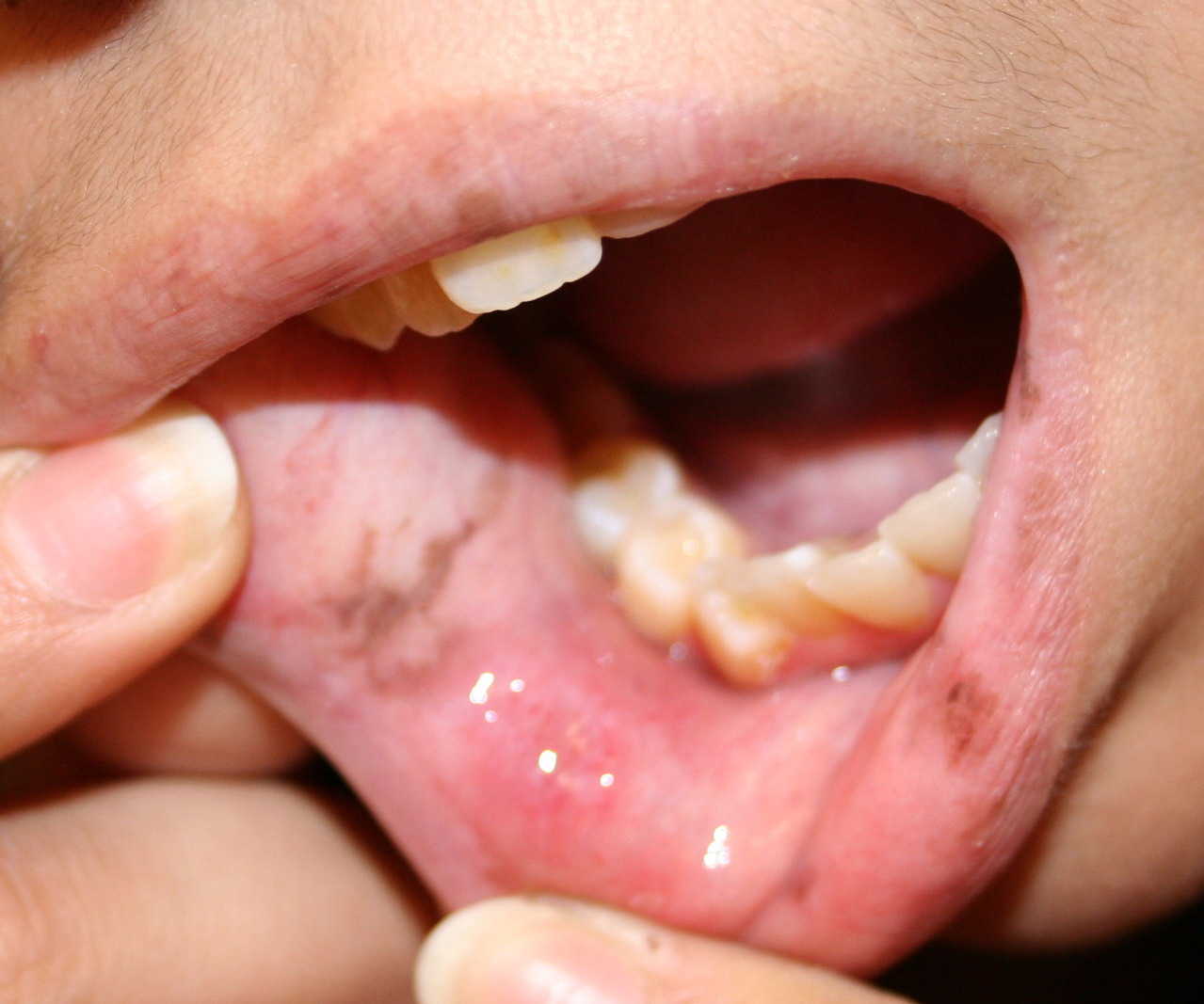 In the chronic phase, the early lichenoid stage may still show evidence of satellite cell necrosis within the epidermis . The overall histologic picture greatly resembles that of lichen planus with hyperkeratosis, hypergranulosis, acanthosis, apoptotic keratinocytes, and a mononuclear cell infiltrate immediately below the epidermis with pigmentary incontinence. As in lichen planus, apoptotic keratinocytes may “drop” into the upper dermis. There may be areas of separation of the basal cell layer from the dermal papillae resembling the clefts seen in severe lichen planus. A rare manifestation is so-called columnar epidermal necrosis, characterized by small foci of total epidermal necrosis accompanied by a lichenoid tissue reaction .