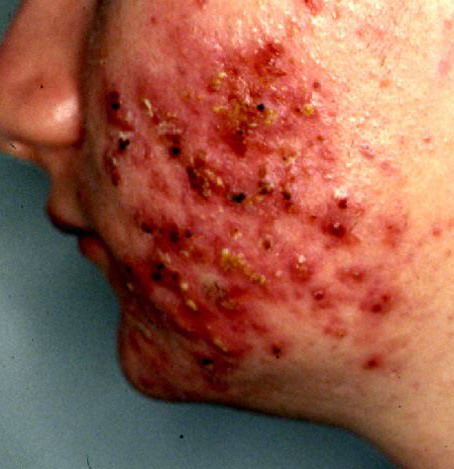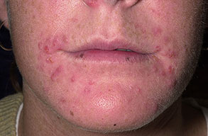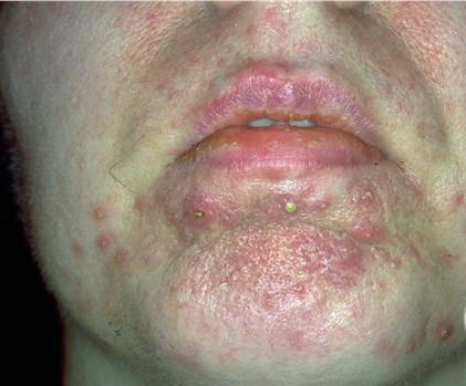 Gram-negative folliculitis may occur in patients with pre-existing acne vulgaris treated with long-term oral antibiotics, especially the tetracyclines. Patients usually give a history of initial success with oral tetracyclines followed by a worsening of their acne. Gram-negative folliculitis may appear as either papulopustules concentrated around the nose or as deep-seated nodules. Culture of these lesions may reveal Enterobacter, Klebsiella, or Escherichia in the papulopustules or Proteus in the nodules. An appropriate antimicrobial agent with adequate Gram-negative coverage should be used. In recalcitrant cases, Gram-negative folliculitis improves with oral isotretinoin for 4 to 5 months. Gram-negative bacteria require a moist environment for survival and the drying action of isotretinoin kills the bacteria. In some cases, an oral cephalosporin may be given for 2 weeks in combination with isotretinoin