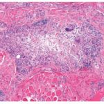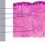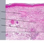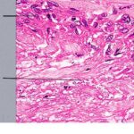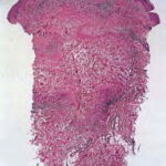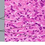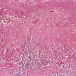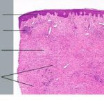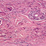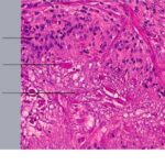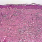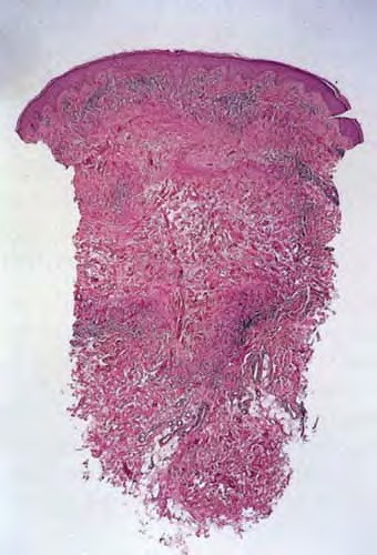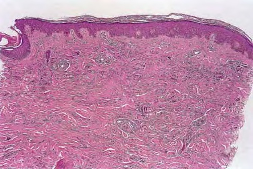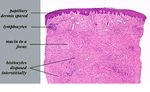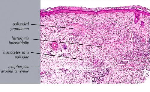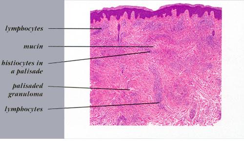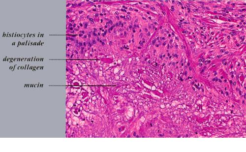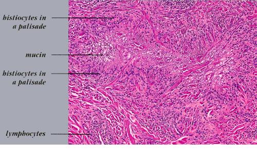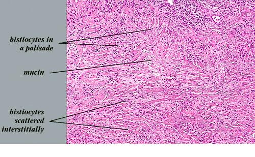 Histologically, granuloma annulare shows an infiltrate of histiocytes and a perivascular infiltrate of lymphocytes that is usually sparse. The histiocytes may be present in an interstitial pattern without apparent organization or in palisades surrounding areas with prominent mucin .Patterns between these two extremes occur, and typically a single biopsy will show histiocytes that are not palisaded, are slightly palisaded, and are well palisaded. Although degenerated collagen or small quantities of fibrin may be present , increased mucin is the hallmark of granuloma annulare. Increased mucin is almost always apparent on routinely stained sections as faint blue material with a stringy, finely granular appearance. Stains such as colloidal iron and Alcian blue can be used to highlight mucin if it is not clearly apparent. Occasionally, sections will not reveal increased mucin, particularly those lacking a palisaded arrangement of histiocytes. In biopsies with well-developed palisades, the central mucinous area is commonly accompanied by a few nuclear fragments or neutrophils. Plasma cells are present rarely. A sparse infiltrate of eosinophils is seen in approximately half of cases, and occasional biopsies show abundant eosinophils . Multinucleated histiocytes are present more often than not, but they are usually few and often subtle. They can occasionally be seen to have engulfed short, thick, blue-gray elastic fibers . The histiocytic infiltrate is usually present throughout the full thickness of the dermis or the middle and upper dermis, but occasionally just the superficial or the deep dermis is involved . Mitotic figures are usually rare (fewer than 1 per 10 high-power fields) but may be as frequent as 7 per 10 high­power fields in rare examples .