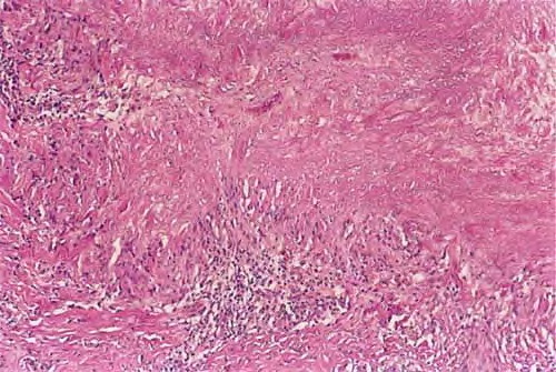 Electron microscopic examination reveals degeneration of both collagen and elastic fibers in granuloma annulare . The macrophages (histiocytes) show a high content of primary Iysosomes and considerable cytoplasmic activity with release of lysosomal enzymes into the extracellular space . Synthesis of types I and III collagen also occurs, probably as a reparative response . A cell-mediated immune response also appears to be involved, marked by prominent activated helper T cells . One immunoperoxidase study of the histiocytic population showed staining for lysozyme but not for other macrophage markers such as HAM 56 or CD­6B . Another demonstrated positivity for these two markers .