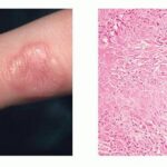 consisting of hundreds of papules that are either discrete or confluent but only rarely show an annular arrangement  perforating granuloma annulare, with umbilicated lesions occurring usually in a localized distribution  and, rarely, in a generalized distribution  erythematous or patch granuloma annulare, showing large, slightly infiltrated erythematous patches, with a palpable border, on which scattered papules may subsequently arise , and (d) subcutaneous/deep granuloma annulare, in which subcutaneous nodules occur, especially in children, either alone or in association with intradermal lesions . The subcutaneous nodules have a clinical appearance similar to that of rheumatoid nodules, although there is no history of arthritis, and there is a greater tendency to occur on the legs, feet, and, occasionally, the head