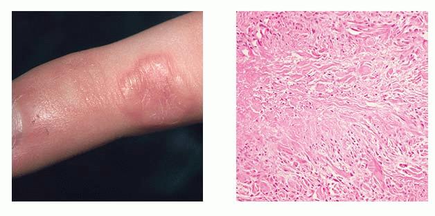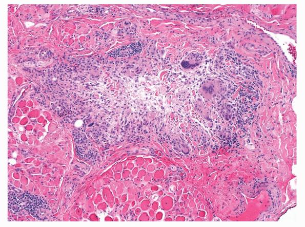 Granuloma annulare is an idiopathic, palisaded, granulomatous condition that is frequently encountered by dermatopathologists. It occurs most commonly in children and young adults but may affect all age groups. Females are affected somewhat more commonly than males. The lesions of granuloma annulare consist of small, firm, asymptomatic papules that are flesh colored or pale red and are often grouped in an annular or circinate fashion . There usually are several lesions, but there may be just one, or there may be many. The lesions are found most commonly on the arms, hands, legs, and feet. The trunk may also be involved, and rare sites of involvement include the palms, penis, ear, and periocular regions . Although chronic, the lesions usually subside after a number of years. Unusual variants of granuloma annulare include  a generalized form,