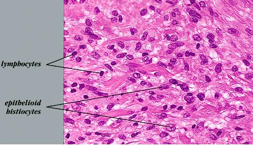 Rare examples of granuloma annulare show aggregates of epithelioid histiocytes, usually with some giant cells and a rim of lymphoid cells, which resemble the granulomas of sarcoidosis . These usually differ from sarcoidal granulomas, however, by showing poorer circumscription and by lacking asteroid bodies. Vascular changes in granuloma annulare are variable but generally inconspicuous . In some instances, however, there are fibrinoid deposits in vessel walls and occlusion of vascular lumina .