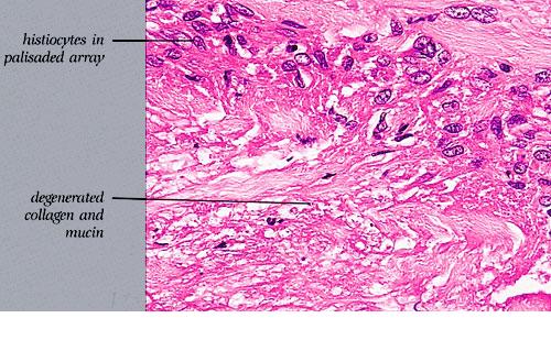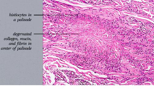 The subcutaneous nodules of deep granuloma annulare usually show large histiocytic palisades surrounding mucin and degenerated collagen . These central, degenerated foci exhibit a pale appearance ; however, examples in which mucin was not apparent or in which the central area appeared more fibrinoid have also been reported . Thus, subcutaneous granuloma annulare may be histologically indistinguishable from rheumatoid nodule, an appearance that has led to the term pseudorheumatoid nodule.