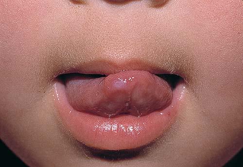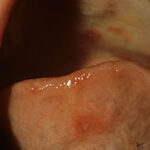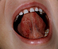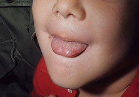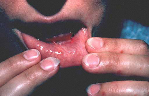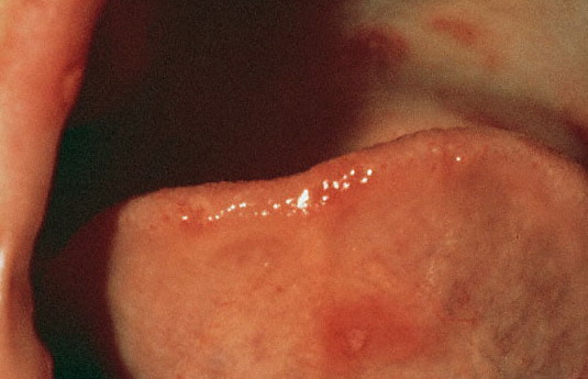 Nearly all cases of HFMD have painful oral lesions. These are generally few in number and are found on the tongue , buccal mucosa, hard palate, and, less frequently, the oropharynx. The lesions start as bright pink macules and papules that progress to vesicles with surrounding erythema. These quickly erode and form yellow to gray erosions surrounded by an erythematous halo. The time between vesicle and erosion is short, and most patients have erosions by the time they visit their physician.