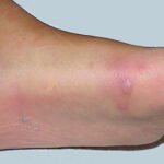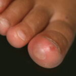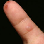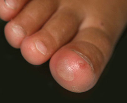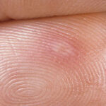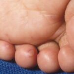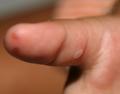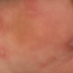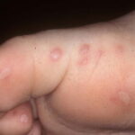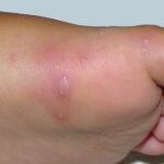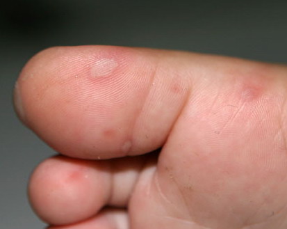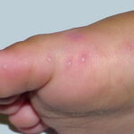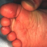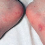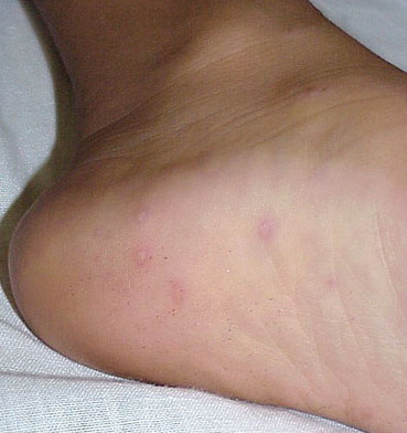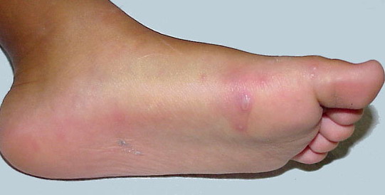 Cutaneous peripheral lesions are present in two-thirds of patients and appear soon after the oral lesions. The lesions are most common on the palms, soles , sides of hands and feet, buttocks and, occasionally, external genitalia, and on the face and legs. They evolve similarly to the oral lesions, starting as red macules that become clear oval, elliptical (football-shaped), or triangular vesicles with surrounding red halos The number of lesions ranges from few to numerous. After crusting, they heal in 7 to 10 days.