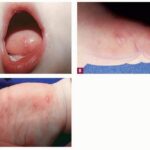 HFMD usually begins with a non-specific prodrome, including low-grade fever [38°C to 39°C (100.4°F to 102.2°F)] that lasts 1 to 2 days, malaise, and, occasionally, abdominal pain or upper respiratory tract symptoms. Sore throat or sore mouth is common and may lead to poor oral intake and dehydration. Cervical and submandibular lymphadenopathy may be present.
