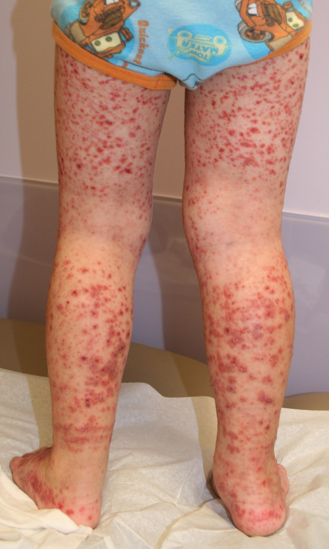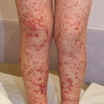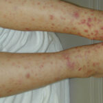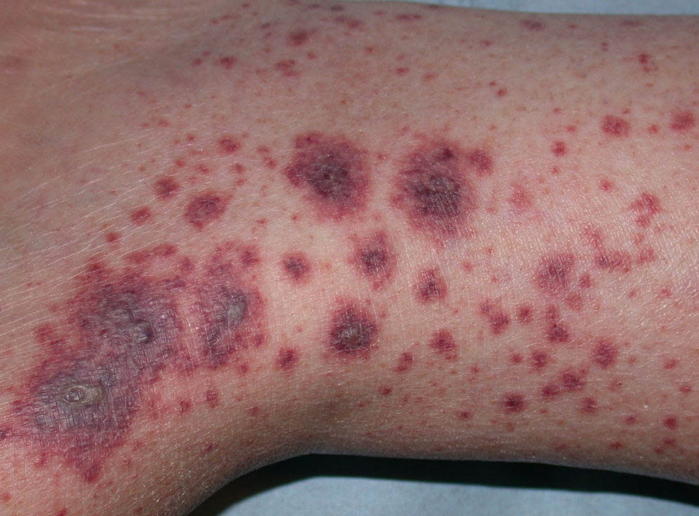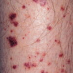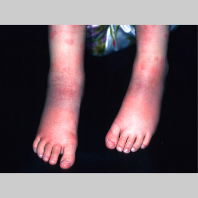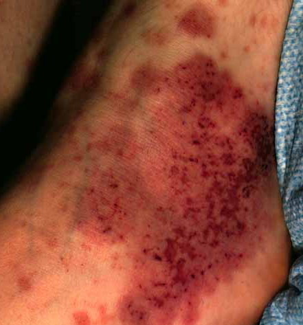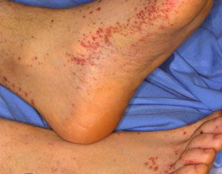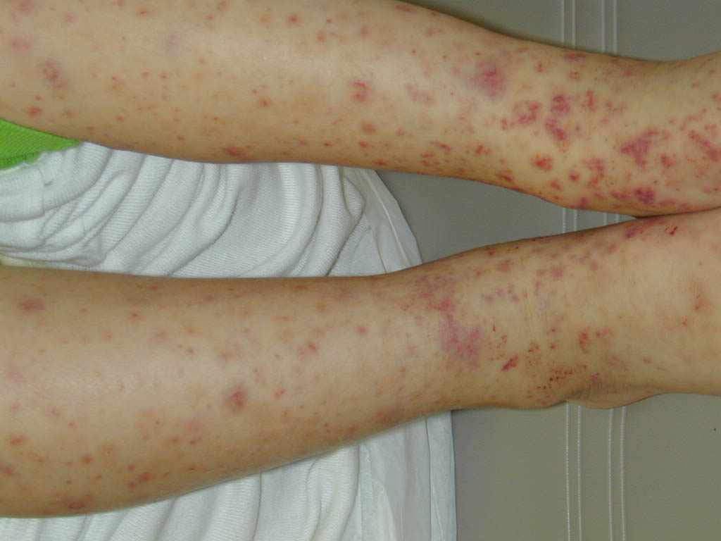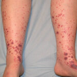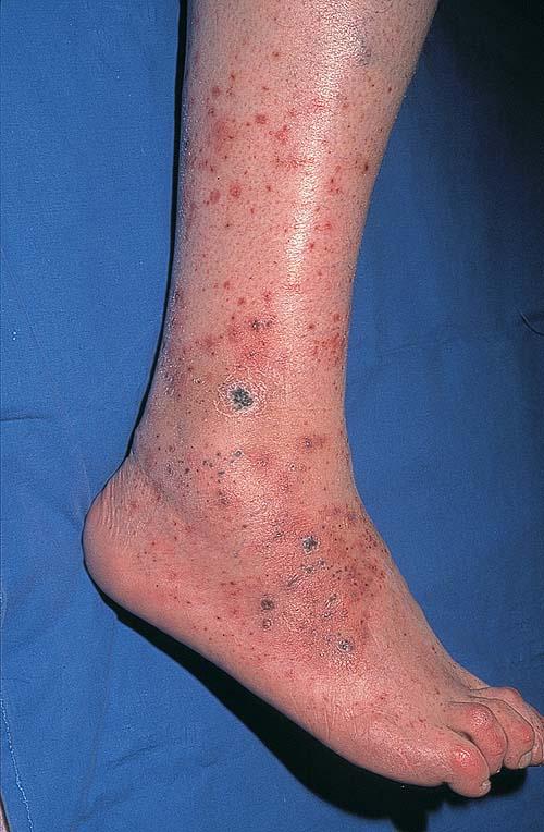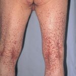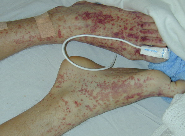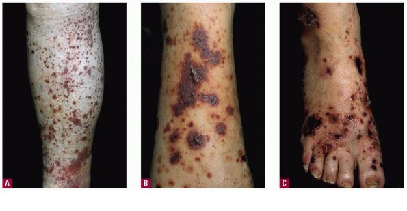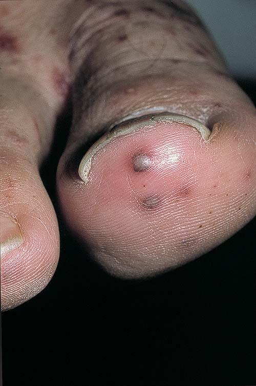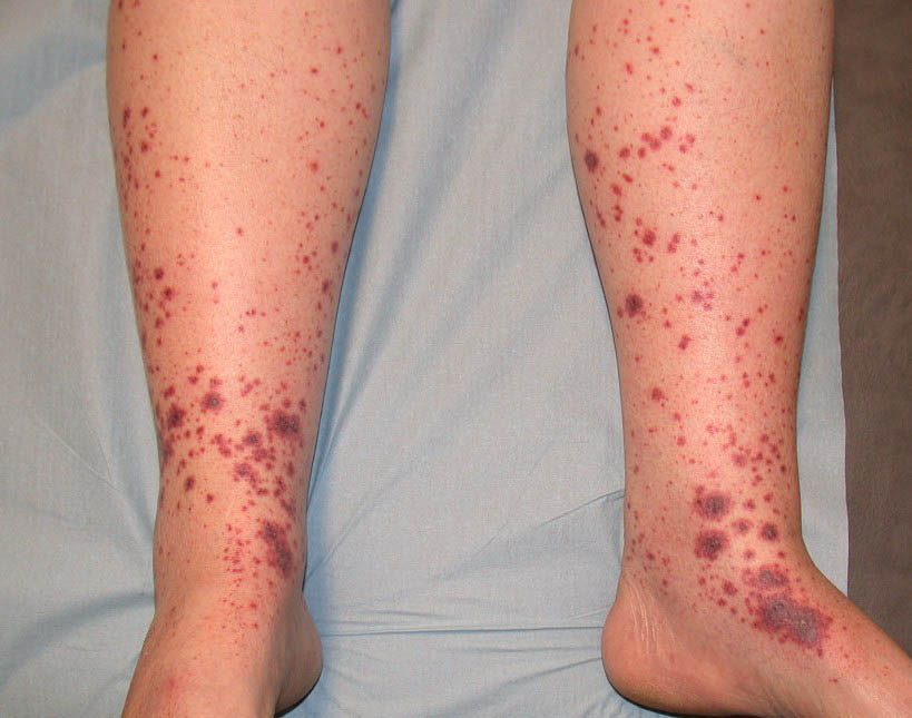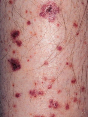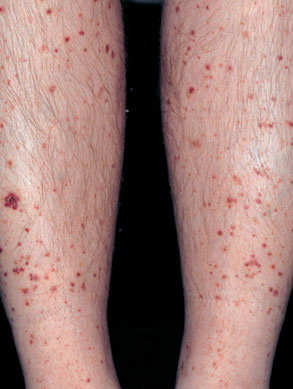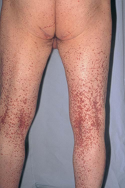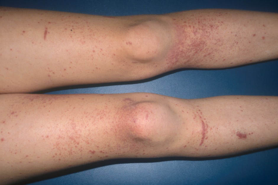 The most widely recognized subgroup of idiopathic CNV is the Henoch-Schönlein syndrome, formerly known as anaphylactoid purpura. It occurs predominantly in children, with a peak incidence at 5 to 6 years of age, but it may occur in adults. A history of a recent upper respiratory tract infection, especially streptococcal, is obtained in up to 75 percent of individuals; however, Henoch-Schönlein syndrome has been associated with other infections. Sites of involvement include the skin, synovia, gastrointestinal tract, and kidneys. Symptoms may be colicky abdominal pain, melena, arthralgia, and hematuria. Long-term morbidity from progressive renal disease occurs in 5 percent of patients. The spread of purpura to the upper parts of the trunk is a predictive factor for renal involvement.