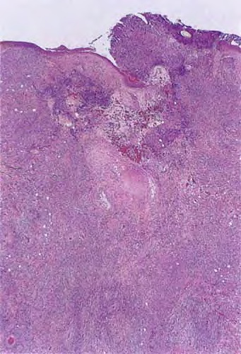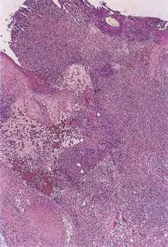 The early lesions of HS demonstrate follicular hyperkeratosis. Other dermal features include active folliculitis or abscess, sinus tract formation, fibrosis, and granuloma formation. There is evidence of an inverse relationship between fibrosis and inflammation, supporting the concept that fibrosis corresponds to areas of chronic involvement.68 Histologic feature examination of adnexal structures reveals inflammation of the apocrine glands in only one-third of cases. Interestingly, involvement of eccrine glands (25 percent) has been reported to be more common than apocrine glands (12 percent).103,104 Poral occlusion or cyst formation may be noted. The subcutis may demonstrate some fibrosis, fat necrosis, or inflammation.