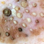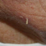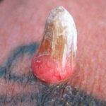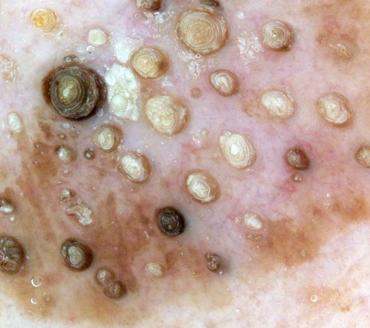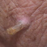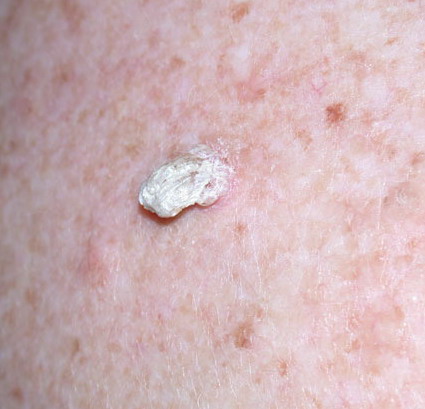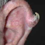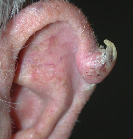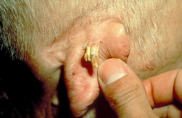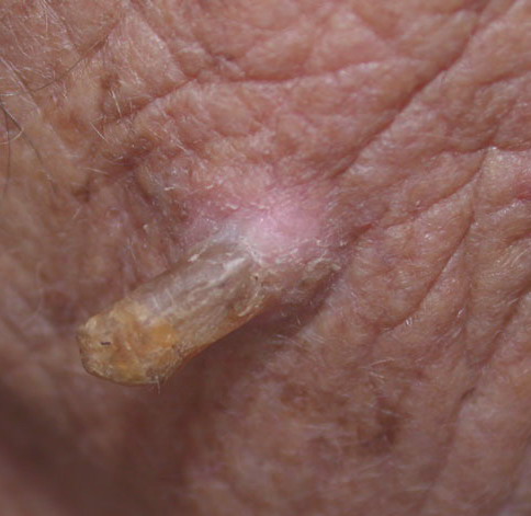 A horn is a conical mass of cornified cells arising over an abnormally differentiating epidermis. Associated underlying pathologic states may include human papilloma virus replication in keratinocytes of a wart or the clonal expansion of mutated keratinocytes in squamous cell carcinoma. A clinical example is verruca vulgaris .