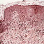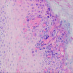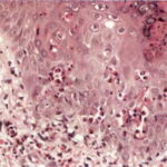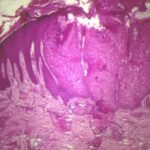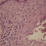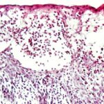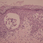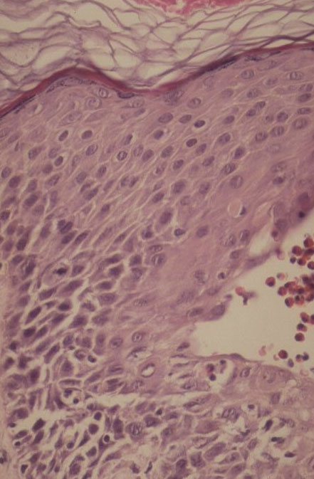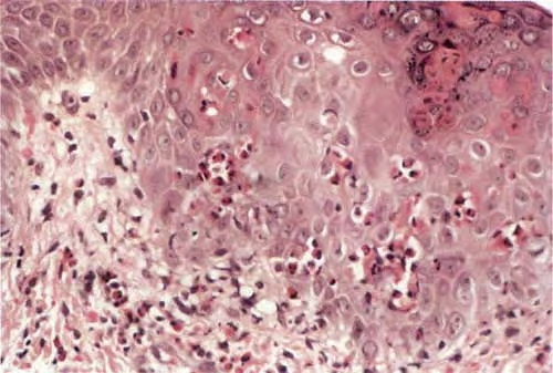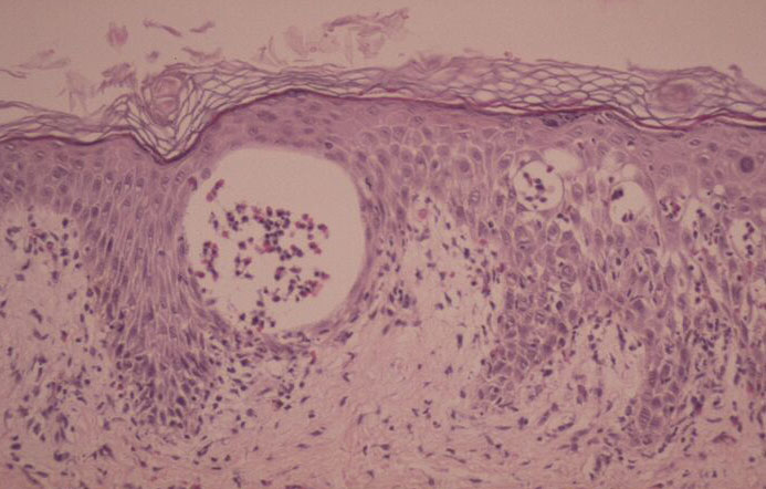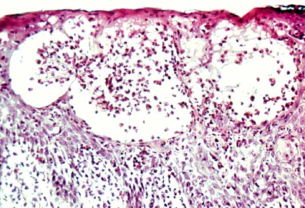 The vesicles seen during the first stage arise within the epidermis and are associated with spongiosis. They are of the type seen in dermatitis . However, they differ from the vesicles of dermatitis by the numerous eosinophils within them and around them in the epidermis (eosinophilic spongiosis) . The epidermis between the vesicles often shows single dyskeratotic cells and whorls of squamous cells with central keratinization. Like the epidermis, the dermis shows an infiltrate containing many eosinophils and some mononuclear cells.