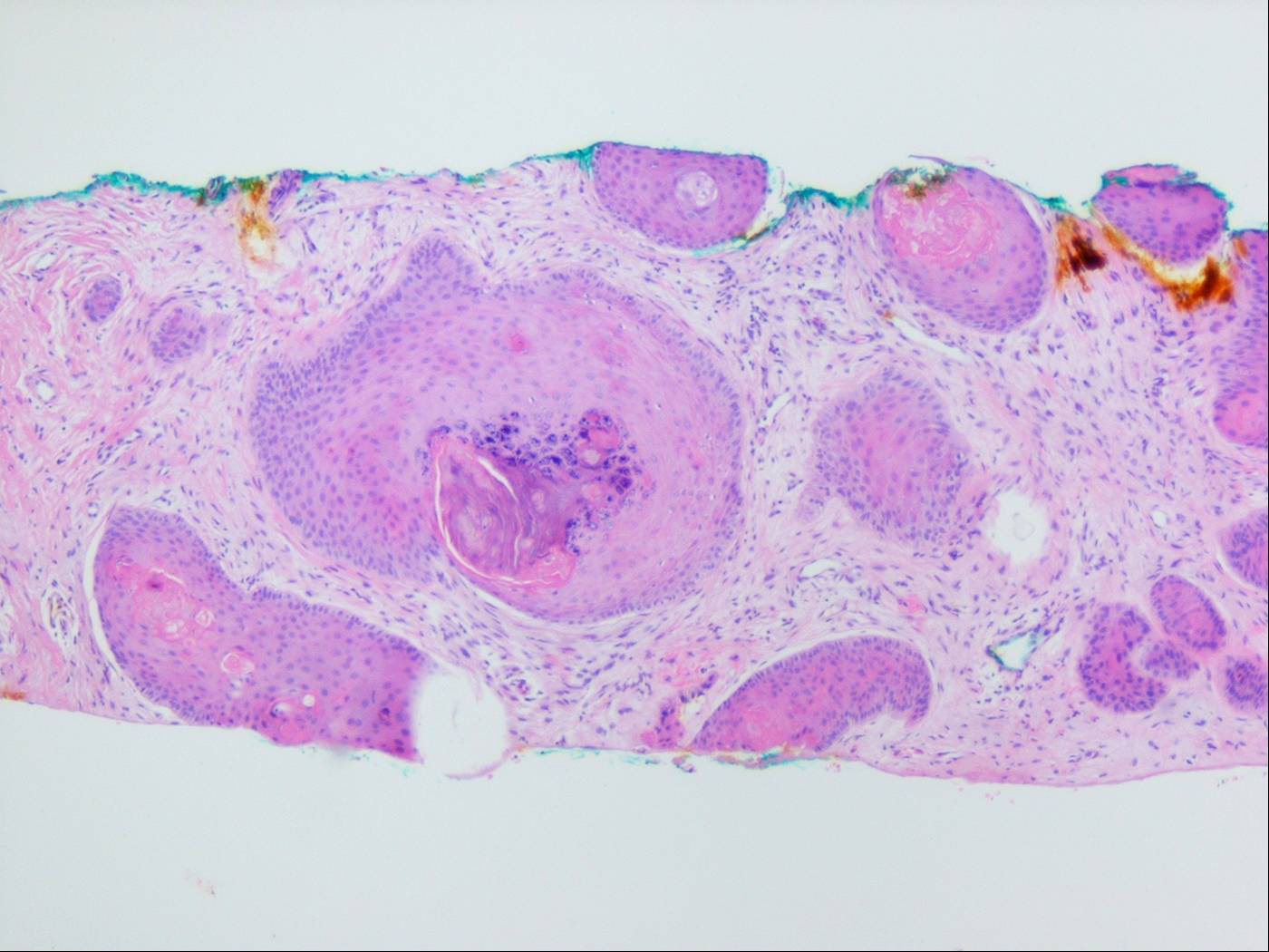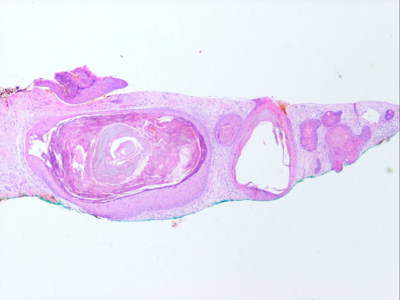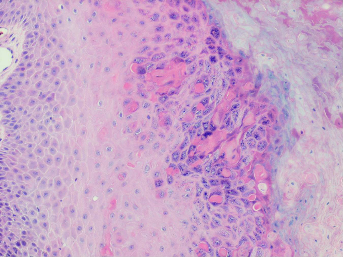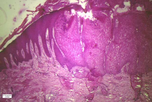 The alterations in the second stage consist of acanthosis, irregular papillomatosis, and hyperkeratosis. Intraepidermal keratinization, consisting of whorls of keratinocytes and of scattered dyskeratotic cells, is often more pronounced than in the first stage. The basal cells show vacuolization and a decrease in their melanin content. The dermis shows a mild, chronic inflammatory infiltrate intermingled with melano-phages. This infiltrate extends into the epidermis in many places.