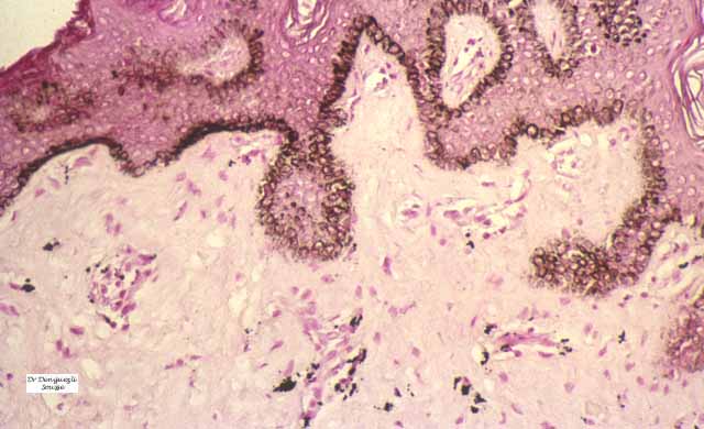 The areas of pigmentation seen in the third stage show extensive deposits of melanin within melanophages located in the upper dermis. Usually, this dermal hyperpigmentation is found in association with a diminution of pigment in the basal layer, the cells of which show vacuolization and degeneration . In some cases, however, the cells of the basal layer contain abundant amounts of melanin .