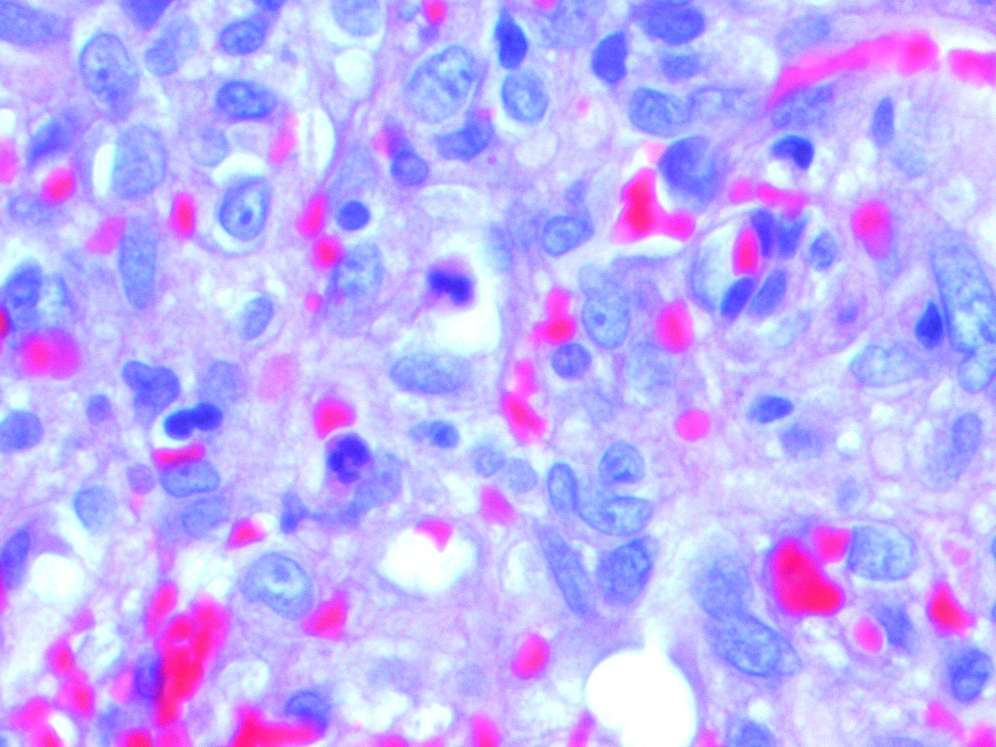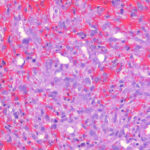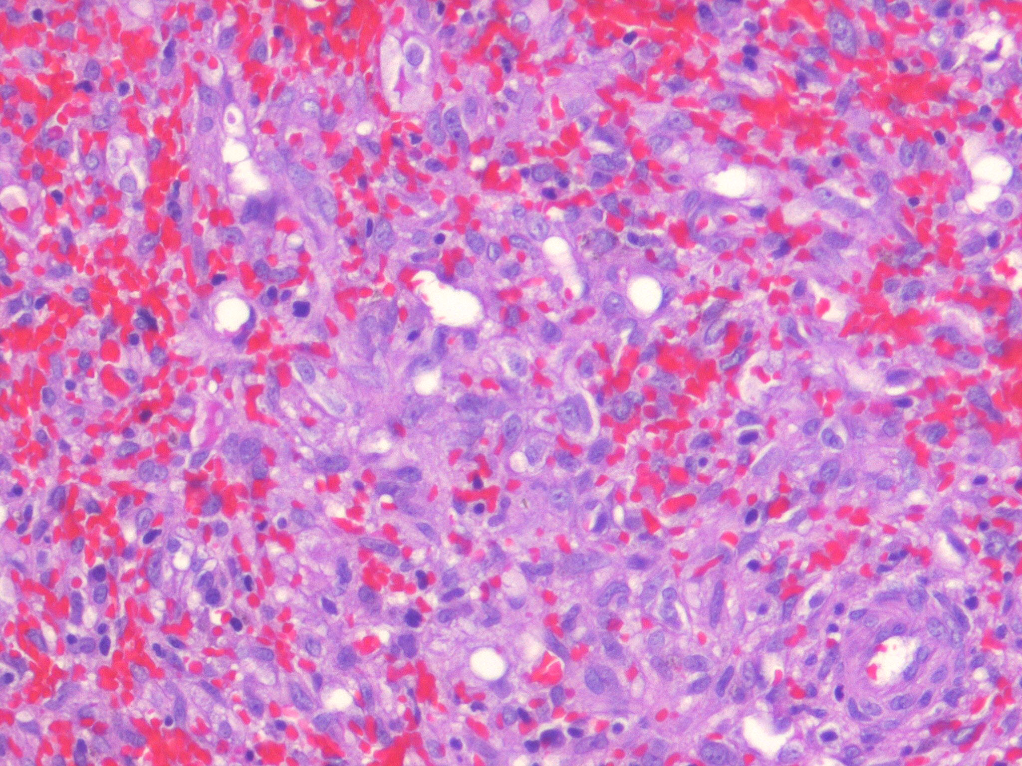 The histology of KHE is characterized by spindled cells with minimal atypia and infrequent mitoses lining slit-like or crescentic vessels containing hemosiderin. The tumor is GLUT-1 negative. The overlap of both clinical and histologic features has led some to suggest that TA and KHE are part of a spectrum of disease. Increased lymphatic spaces have suggested a lymphatic origin, similar to that of Kaposi sarcoma.