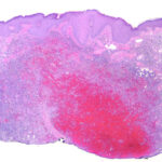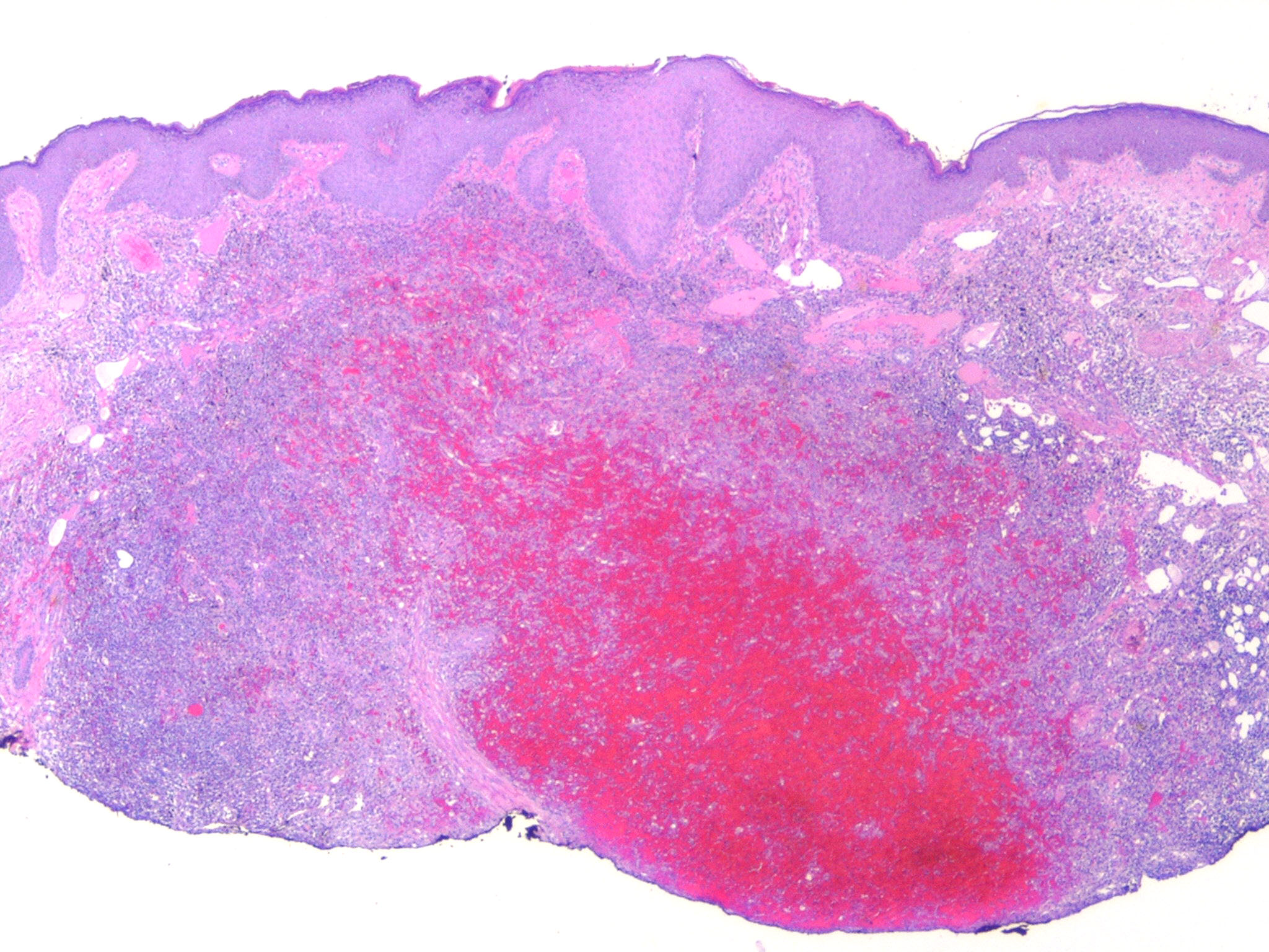 Targetoid hemosiderotic hemangioma is a benign lesion presenting as a violaceous papule, often surrounded by a pale rim and peripheral ecchymotic halo, which fades with time. Lesions usually present on the trunk or extremities and histologically consist of dilated vascular channels within intraluminal papillary projections dissecting into collagen bundles in the subcutis. Extravasated erythrocytes and hemosiderin are present, hence the designation.