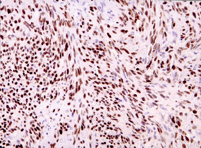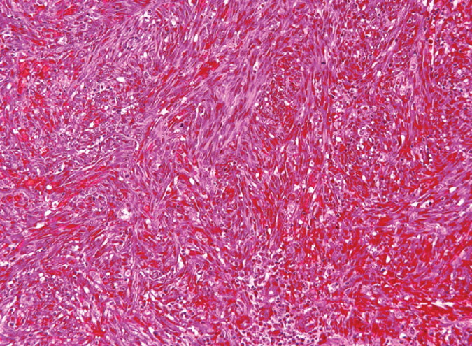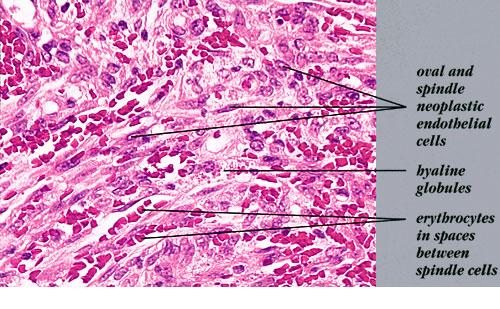 Nodular lesions consist predominantly of spindle cells arranged in bundles and interlacing fascicles and interspersed, irregular, slit-like vascular spaces without endothelial linings. Advanced lesions may display pronounced pleomorphism, nuclear atypia, and mitotic figures. At the periphery of solid tumors, (lymph) angiomatous-like portions of KS with bizarre vascular lumina and intravascular and extravasated erythrocytes, as well as siderophages, may be preserved. Erythrocytes, which appear as eosinophilic globules, are trapped within the slits and clefts formed by the spindle cells and erythrophagocytosis are occasionally observed. As in all other stages of KS, a moderate inflammatory infiltrate consisting of lymphocytes, histiocytes, plasma cells, and, sporadically, neutrophils is regularly present.