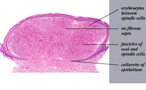The pathology of KS plaques is more characteristic and reveals extensive vascular proliferation at all levels of the dermis with multiple dilated and angulated vascular spaces dissecting the collagen leaving a spongy network of collagen tissue. A characteristic sign of KS papules is the presence of solid cords and fascicles of spindle cells arranged between the jagged vascular channels. This biphasic angiomatous and solid tumor morphology changes to a clear-cut sarcomatous morphology with progression of the disease.