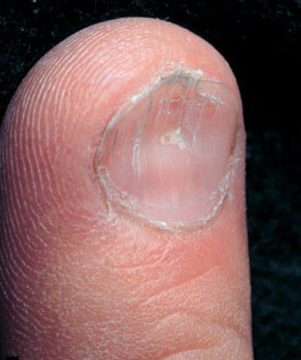 In koilonychia the nail plate is thin and spoon shaped. Koilonychia is physiologic in the toenails of children. In adults it can be a sign of iron deficiency or occupational factors