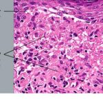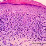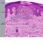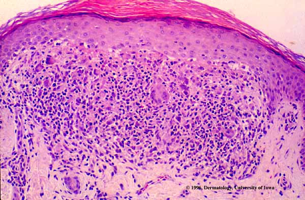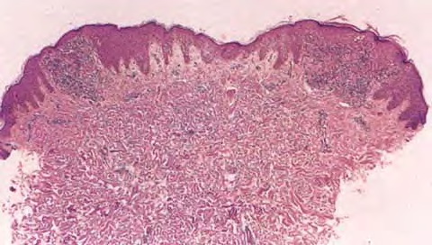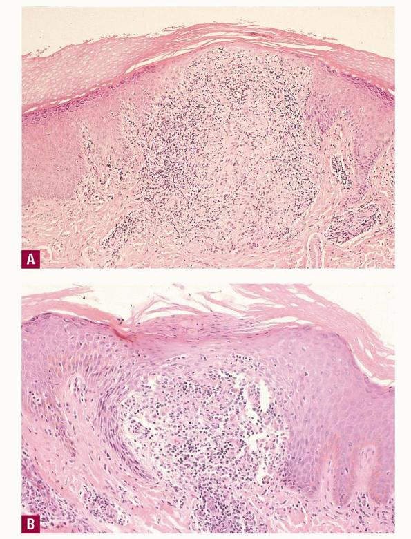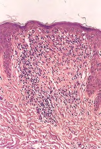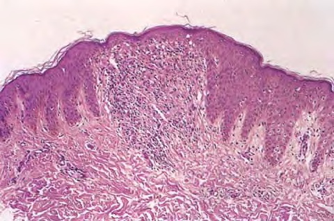 A dense mass of infiltrating lymphohistiocytic cells is situated immediately below the epidermis and results in widening of the papillary dermis with elongation and the appearance of embracement by neighboring rete ridges . Occasionally, two or three papillary spaces merge together as part of the inflammatory